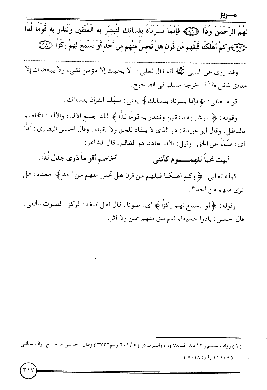 {لَهُم الرَّحْمَن ودا (96) فَإِنَّمَا يسرناه بلسانك لتبشر بِهِ الْمُتَّقِينَ وتنذر بِهِ قوما لدا (97) وَكم أهلكنا قبلهم من قرن هَل تحس مِنْهُم من أحد أَو تسمع لَهُم ركزا (98) }