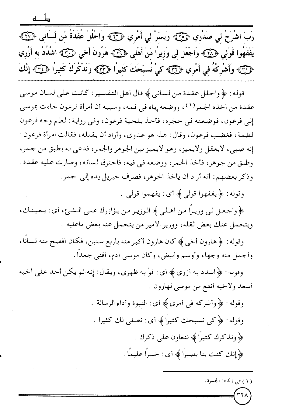 {رب اشرح لي صَدْرِي (25) وَيسر لي أَمْرِي (26) واحلل عقدَة من لساني (27) يفقهوا قولي (28) وَاجعَل لي وزيرا من أَهلِي (29) هرون أخي (30) اشْدُد بِهِ أزري (31) وأشركه فِي أَمْرِي (32) كي نسبحك كثيرا (33) ونذكرك كثيرا (34) إِنَّك}