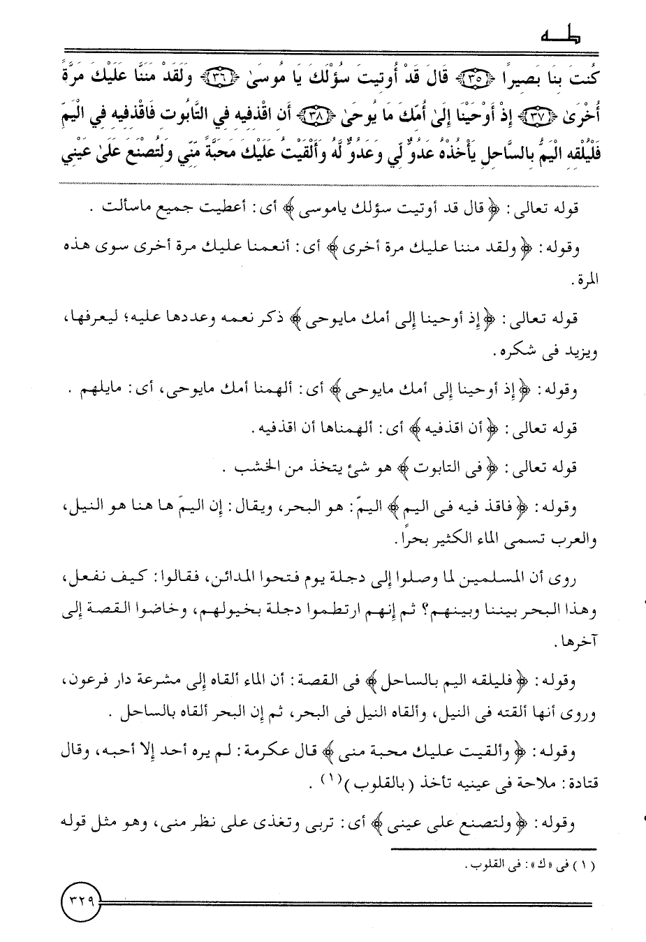 وَقَوله: {وألقيت عَلَيْك محبَّة مني} قَالَ عِكْرِمَة: لم يره أحد إِلَّا أحبه، وَقَالَ قَتَادَة: ملاحة فِي عَيْنَيْهِ تَأْخُذ (بالقلوب) .