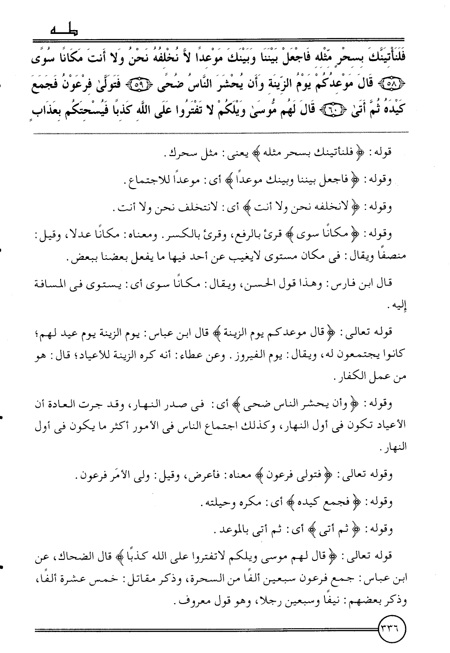 {فلنأتينك بِسحر مثله فَاجْعَلْ بَيْننَا وَبَيْنك موعدا لَا نخلفه نَحن وَلَا أَنْت مَكَانا سوى (58) قَالَ مَوْعدكُمْ يَوْم الزِّينَة وَأَن يحْشر النَّاس ضحى (59) فَتَوَلّى فِرْعَوْن فَجمع كَيده ثمَّ أَتَى (60) قَالَ لَهُم مُوسَى وَيْلكُمْ لَا تفتروا على الله كذبا فيسحتكم بِعَذَاب}