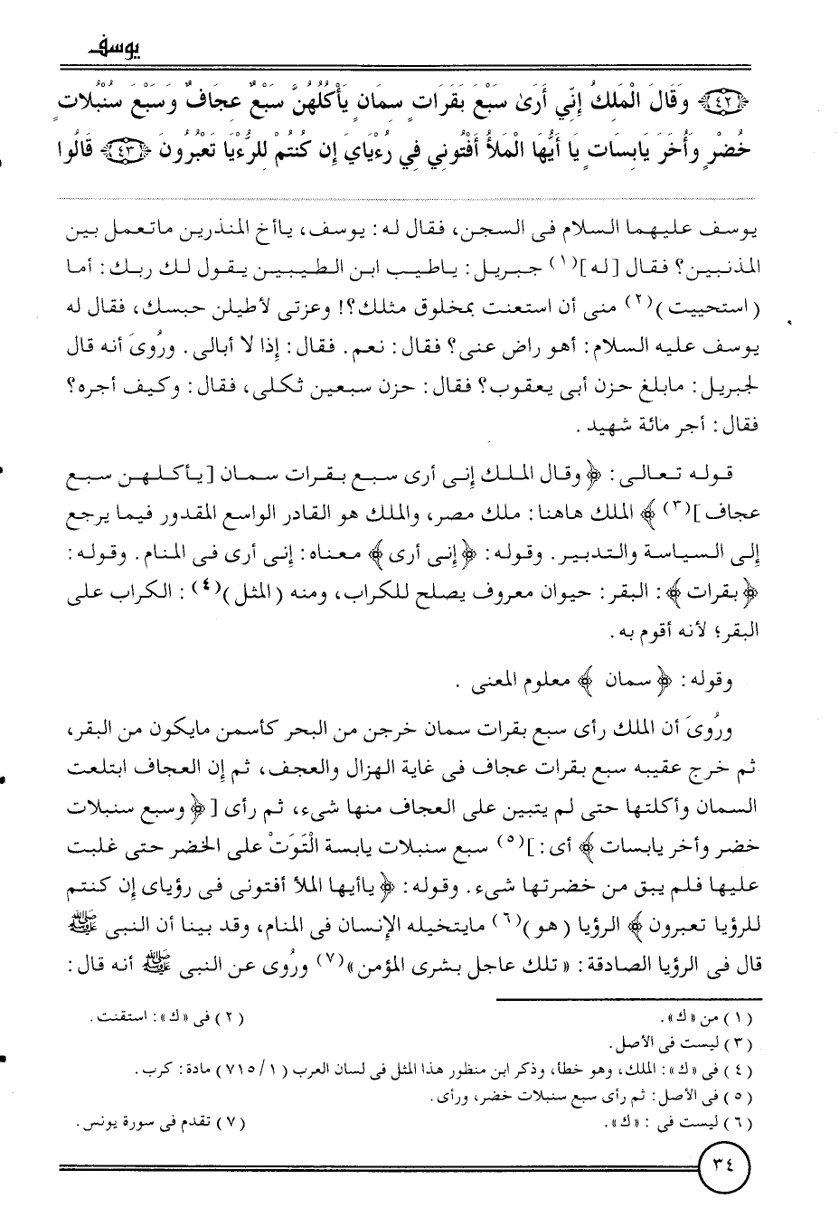 وَرُوِيَ أَن الْملك رأى سبع بقرات سمان خرجن من الْبَحْر كأسمن مَا يكون من الْبَقر، ثمَّ خرج عَقِيبه سبع بقرات عجاف فِي غَايَة الهزال والعجف، ثمَّ إِن الْعِجَاف ابتلعت السمان وأكلتها حَتَّى لم يتَبَيَّن على الْعِجَاف مِنْهَا شَيْء، ثمَّ رأى [ {وَسبع سنبلات خضر وَأخر يابسات} أَي:] سبع سنبلات يابسة التوت على الْخضر حَتَّى غلبت عَلَيْهَا فَلم يبْق من خضرتها شَيْء. وَقَوله: {يَا أَيهَا الْمَلأ أفتوني فِي رُؤْيَايَ إِن كُنْتُم للرؤيا تعبرون} الرُّؤْيَا (هُوَ) مَا يتخيله الْإِنْسَان فِي الْمَنَام، وَقد بَينا أَن النَّبِي قَالَ فِي الرُّؤْيَا الصادقة: " تِلْكَ عَاجل بشرى الْمُؤمن " وَرُوِيَ عَن النَّبِي أَنه قَالَ:
