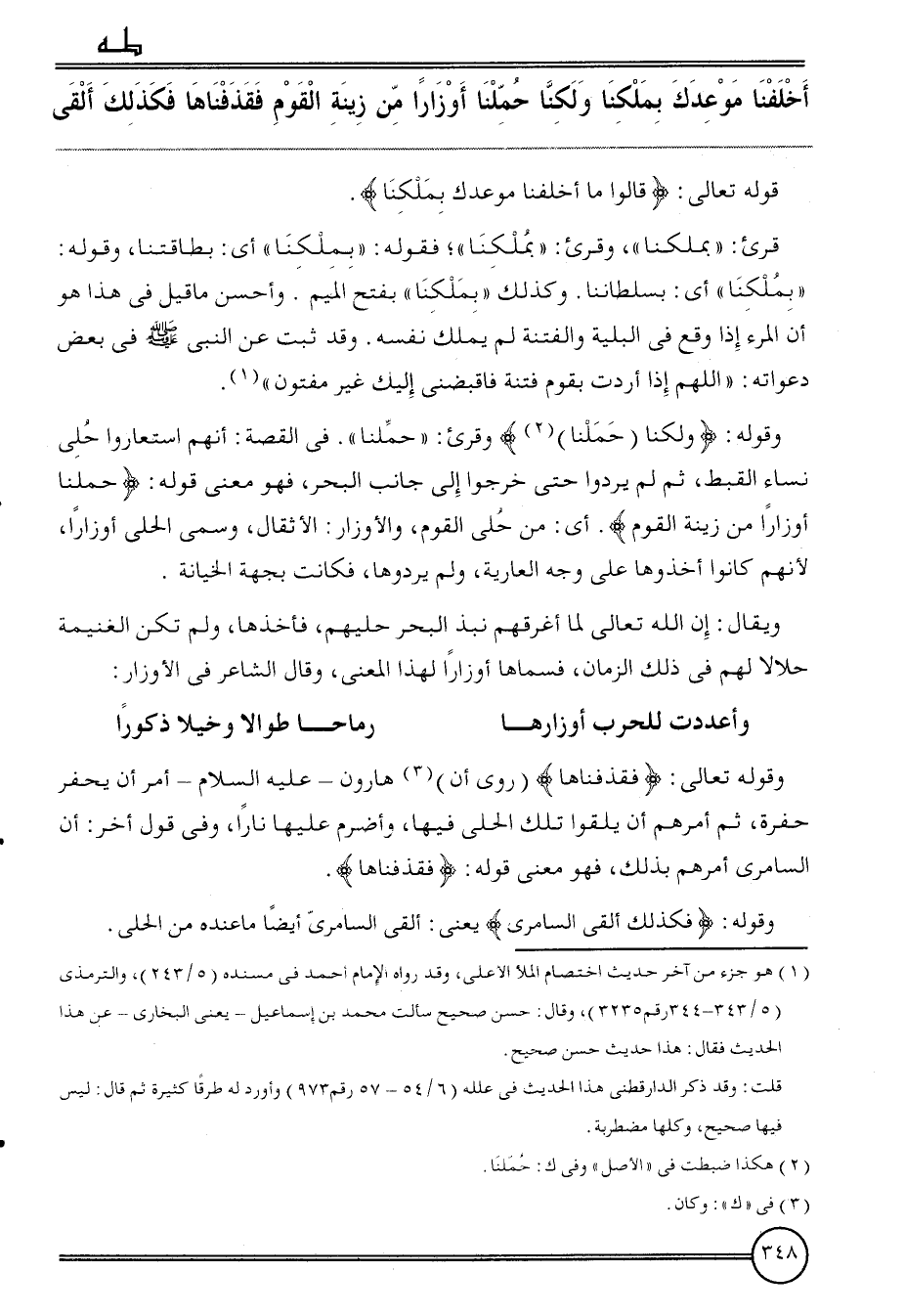 وَقَوله: {وَلَكنَّا (حملنَا} ) وقرىء: " حملنَا ". فِي الْقِصَّة: أَنهم استعاروا حلي نسَاء القبط، ثمَّ لم يردوا حَتَّى خَرجُوا إِلَى جَانب الْبَحْر، فَهُوَ معنى قَوْله: {حملنَا أوزارا من زِينَة الْقَوْم} . أَي: من حلي الْقَوْم، والأوزار: الأثقال، وسمى الْحلِيّ أوزارا، لأَنهم كَانُوا أخذوها على وَجه الْعَارِية، وَلم يردوها، فَكَانَت بِجِهَة الْخِيَانَة.
