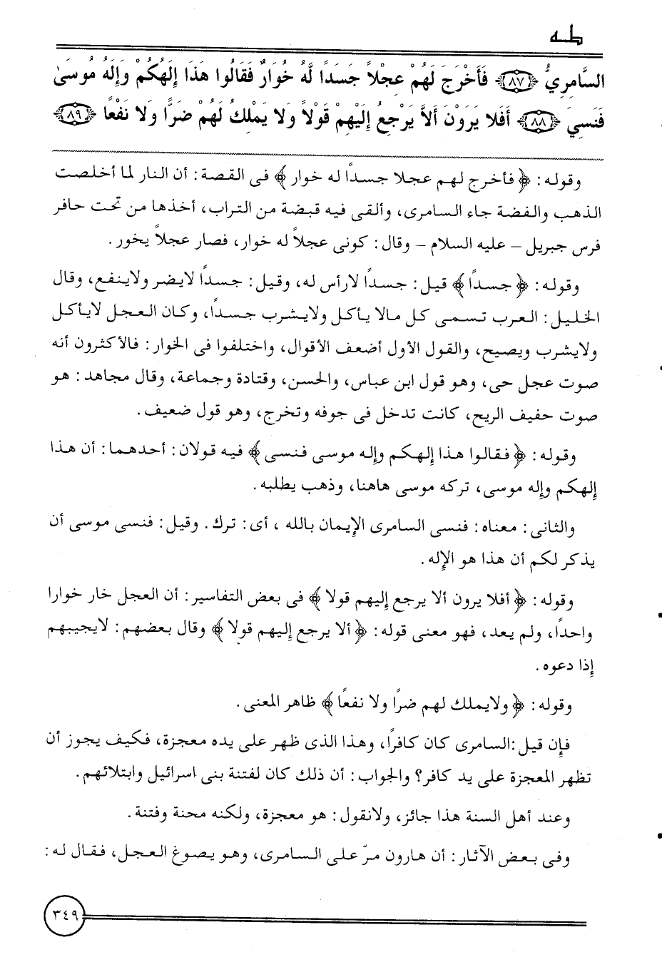 {السامري (87) فَأخْرج لَهُم عجلا جسدا لَهُ خوار فَقَالُوا هَذَا إِلَهكُم وإله مُوسَى فنسي (88) أَفلا يرَوْنَ أَلا يرجع إِلَيْهِم قولا وَلَا يملك لَهُم ضرا وَلَا نفعا (89) }