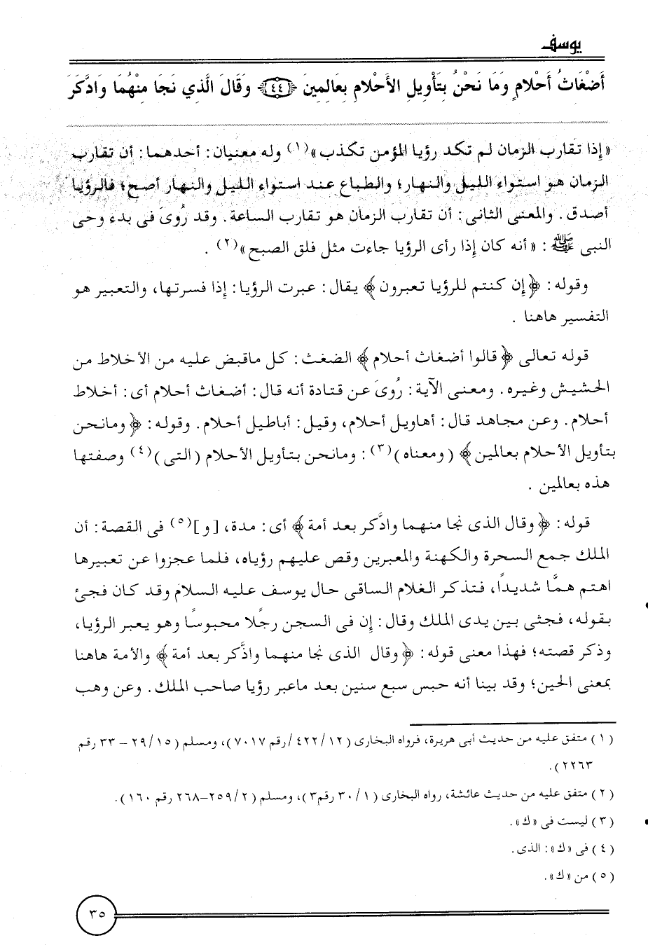 {أضغاث أَحْلَام وَمَا نَحن بِتَأْوِيل الأحلام بعالمين (44) وَقَالَ الَّذِي نجا مِنْهُمَا وادكر} " إِذا تقَارب الزَّمَان لم تكد رُؤْيا الْمُؤمن تكذب " وَله مَعْنيانِ: أَحدهمَا: أَن تقَارب الزَّمَان هُوَ اسْتِوَاء اللَّيْل وَالنَّهَار؛ والطباع عِنْد اسْتِوَاء اللَّيْل وَالنَّهَار أصح؛ فالرؤيا أصدق. وَالْمعْنَى الثَّانِي: أَن تقَارب الزَّمَان هُوَ تقَارب السَّاعَة. وَقد رُوِيَ فِي بَدْء وَحي النَّبِي: " أَنه كَانَ إِذا رأى الرُّؤْيَا جَاءَت مثل فلق الصُّبْح ".