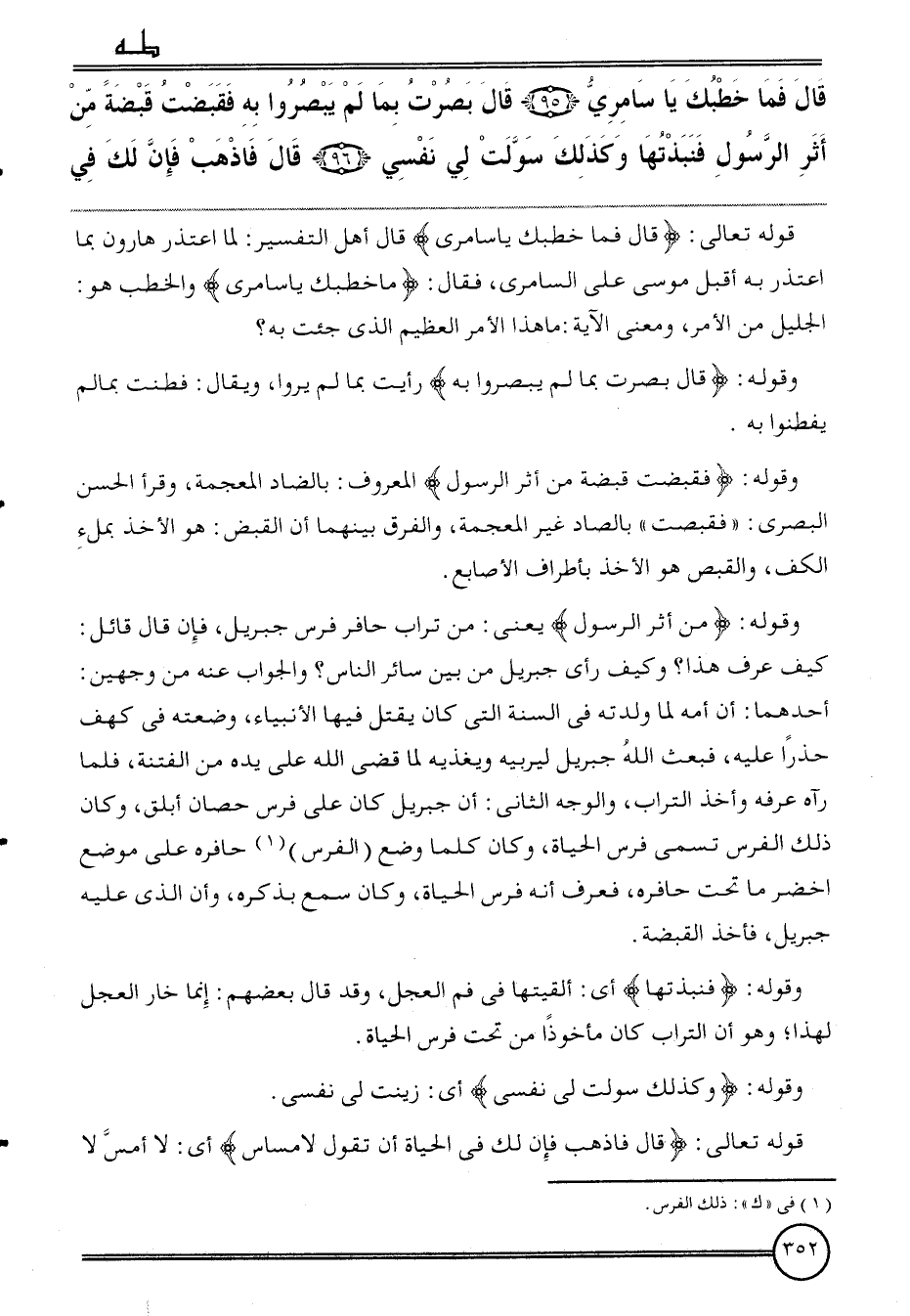 {قَالَ فَمَا خَطبك يَا سامري (95) قَالَ بصرت بِمَا لم يبصروا بِهِ فقبضت قَبْضَة من أثر الرَّسُول فنبذتها وَكَذَلِكَ سَوَّلت لي نَفسِي (96) قَالَ فَاذْهَبْ فَإِن لَك فِي}