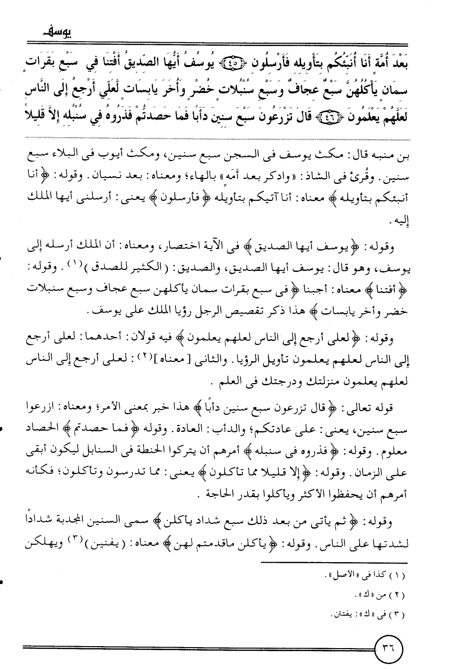 {بعد أمة أَنا أنبئكم بتأويله فأرسلون (45) يُوسُف أَيهَا الصّديق أَفْتِنَا فِي سبع بقرات سمان يأكلهن سبع عجاف وَسبع سنبلات خضر وَأخر يابسات لعَلي أرجع إِلَى النَّاس لَعَلَّهُم يعلمُونَ (46) قَالَ تزرعون سبع سِنِين دأبا فَمَا حصدتم فذروه فِي سنبله إِلَّا قَلِيلا} بن مُنَبّه قَالَ: مكث يُوسُف فِي السجْن سبع سِنِين، وَمكث أَيُّوب فِي الْبلَاء سبع سِنِين. وقرىء فِي الشاذ: " وادكر بعد أمة " بِالْهَاءِ؛ وَمَعْنَاهُ: بعد نِسْيَان. وَقَوله: {أَنا أنبئكم بتأويله} مَعْنَاهُ: أَنا آتيكم بتأويله {فأرسلون} يَعْنِي: أَرْسلنِي أَيهَا الْملك إِلَيْهِ.
