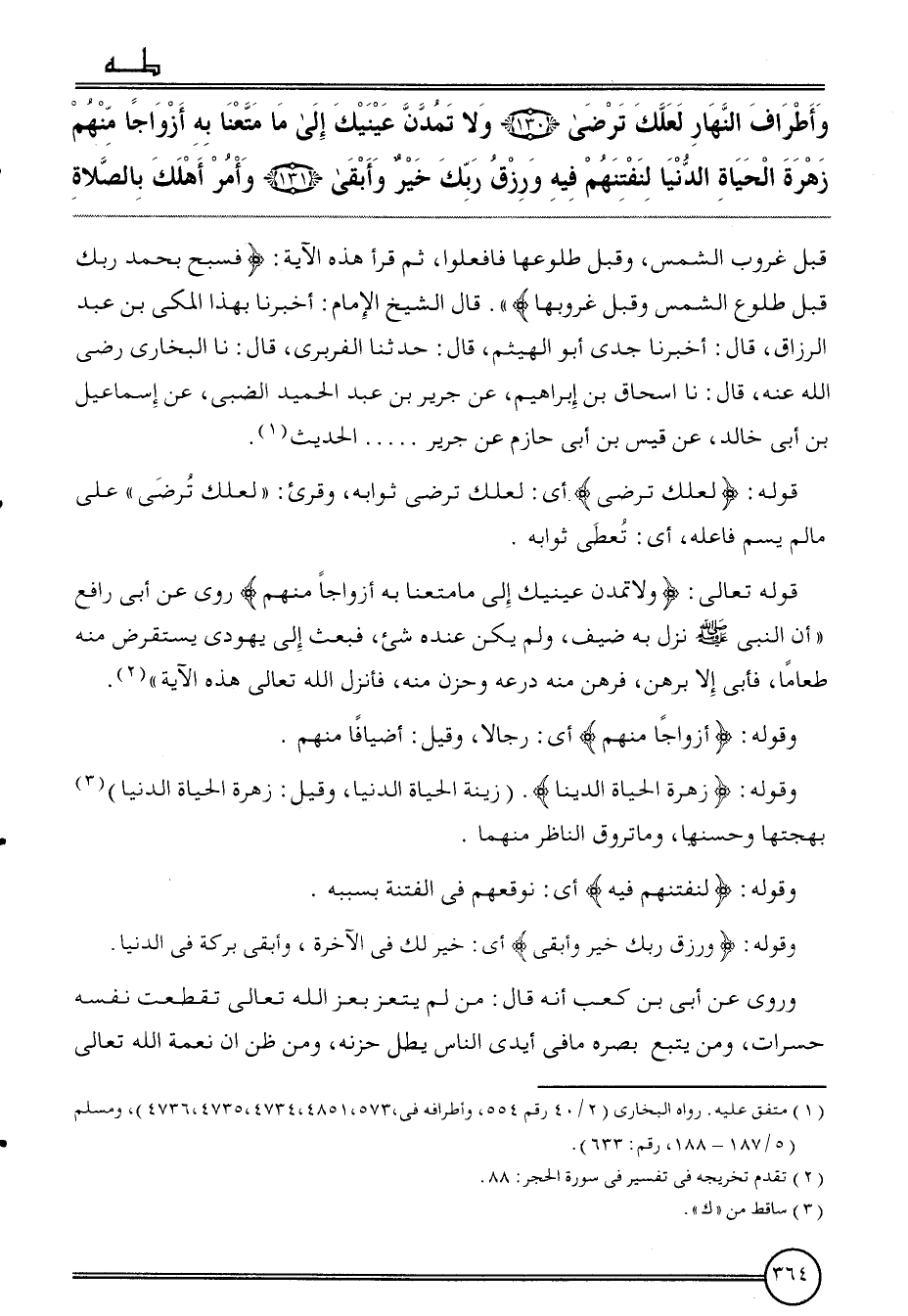 {وأطراف النَّهَار لَعَلَّك ترْضى (130) وَلَا تَمُدَّن عَيْنَيْك إِلَى مَا متعنَا بِهِ أَزْوَاجًا مِنْهُم زهرَة الْحَيَاة الدُّنْيَا لنفتنهم فِيهِ وزرق رَبك خير وَأبقى (131) وَأمر أهلك بِالصَّلَاةِ} قبل غرُوب الشَّمْس، وَقبل طُلُوعهَا فافعلوا، ثمَّ قَرَأَ هَذِه الْآيَة: {فسبح بِحَمْد رَبك قبل طُلُوع الشَّمْس وَقبل غُرُوبهَا} . قَالَ الشَّيْخ الإِمَام: أخبرنَا بِهَذَا الْمَكِّيّ بن عبد الرَّزَّاق، قَالَ: أخبرنَا جدي أَبُو الْهَيْثَم، قَالَ: حَدثنَا الْفربرِي، قَالَ: نَا البُخَارِيّ رَضِي الله عَنهُ، قَالَ: نَا إِسْحَاق بن إِبْرَاهِيم، عَن جرير بن عبد الحميد الضَّبِّيّ، عَن إِسْمَاعِيل بن أبي خَالِد، عَن قيس بن أبي حَازِم عَن جرير ... ... الحَدِيث.