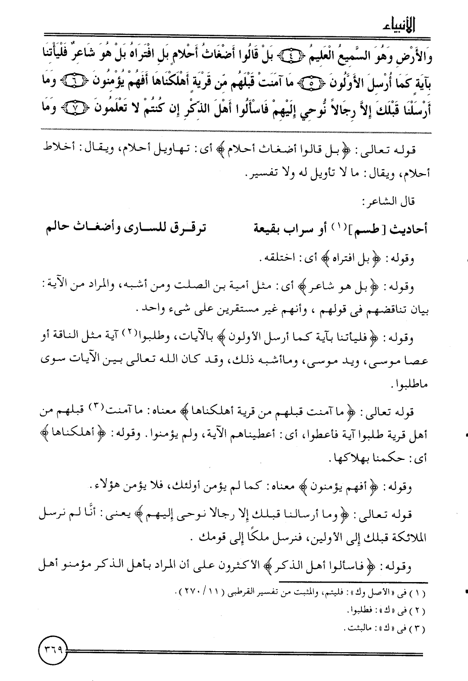 {وَالْأَرْض وَهُوَ السَّمِيع الْعَلِيم (4) بل قَالُوا أضغاث أَحْلَام بل افتراه بل هُوَ شَاعِر فليأتنا بِآيَة كَمَا أرسل الْأَولونَ (5) مَا آمَنت قبلهم من قَرْيَة أهلكناهم أفهم يُؤمنُونَ (6) وَمَا أرسلنَا قبلك إِلَّا رجَالًا نوحي إِلَيْهِم فاسألوا أهل الذّكر إِن كُنْتُم لَا تعلمُونَ (7) وَمَا}