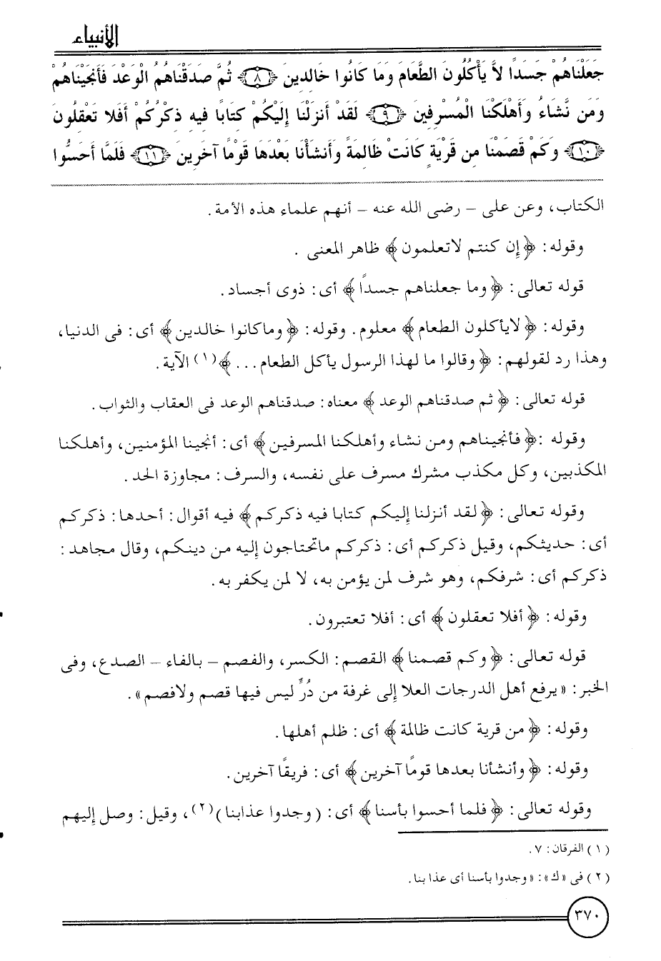 {جعلناهم جسدا لَا يَأْكُلُون الطَّعَام وَمَا كَانُوا خَالِدين (8) ثمَّ صدقناهم الْوَعْد فأنجيناهم وَمن نشَاء وأهلكنا المسرفين (9) لقد أنزلنَا إِلَيْكُم كتابا فِيهِ ذكركُمْ أَفلا تعقلون (10) وَكم قصمنا من قَرْيَة كَانَت ظالمة وأنشأنا بعْدهَا قوما آخَرين (11) فَلَمَّا أحسوا} الْكتاب، وَعَن عَليّ - رَضِي الله عَنهُ - أَنهم عُلَمَاء هَذِه الْأمة.