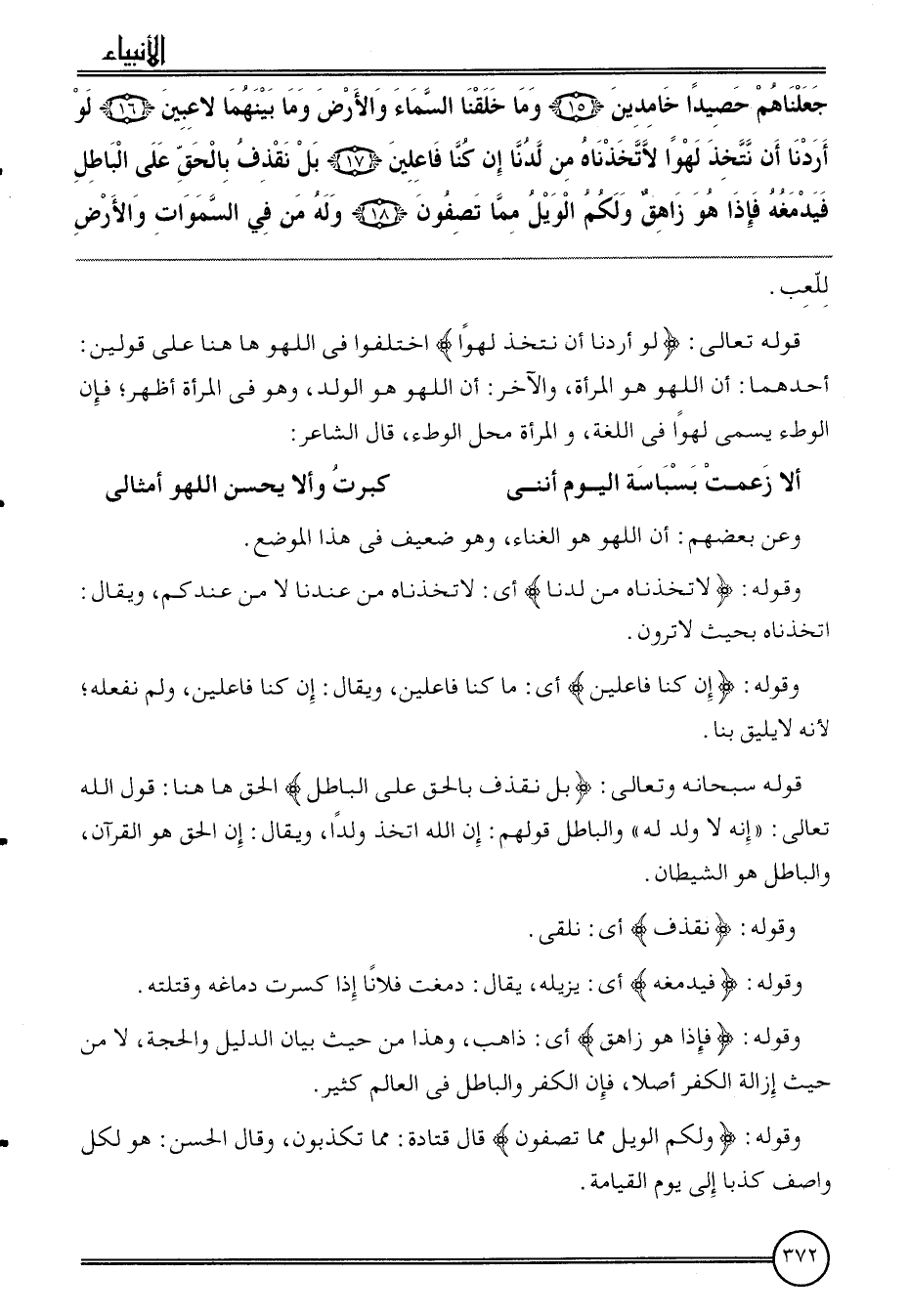 {جعلناهم حصيدا خامدين (15) وَمَا خلقنَا السَّمَاء وَالْأَرْض وَمَا بَينهمَا لاعبين (16) لَو أردنَا أَن نتَّخذ لهوا لاتخذناه من لدنا إِن كُنَّا فاعلين (17) بل نقذف بِالْحَقِّ على الْبَاطِل فيدمغه فَإِذا هُوَ زاهق وَلكم الويل مِمَّا تصفون (18) وَله من فِي السَّمَوَات وَالْأَرْض} للعب.