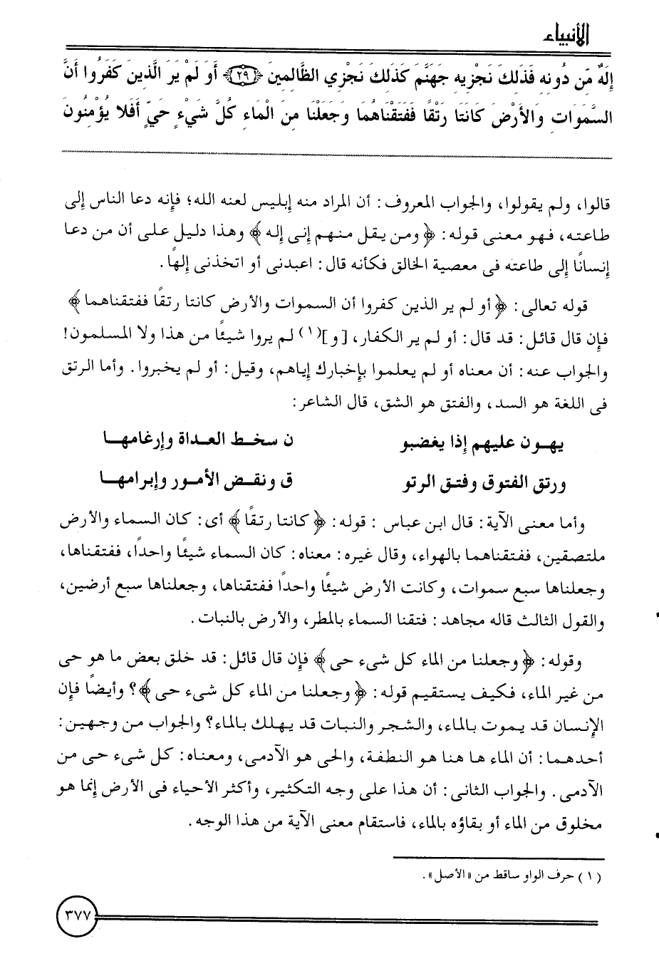 قَوْله تَعَالَى: {أَو لم ير الَّذين كفرُوا أَن السَّمَوَات وَالْأَرْض كَانَتَا رتقا ففتقناهما} فَإِن قَالَ قَائِل: قد قَالَ: أَو لم ير الْكفَّار، [و] لم يرَوا شَيْئا من هَذَا وَلَا الْمُسلمُونَ! وَالْجَوَاب عَنهُ: أَن مَعْنَاهُ أَو لم يعلمُوا بإخبارك إيَّاهُم، وَقيل: أَو لم يخبروا. وَأما الرتق فِي اللُّغَة هُوَ السد، والفتق هُوَ الشق، قَالَ الشَّاعِر: