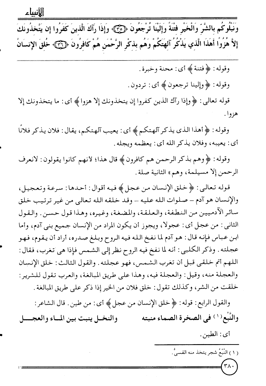 {ونبلوكم بِالشَّرِّ وَالْخَيْر فتْنَة وإلينا ترجعون (35) وَإِذا رآك الَّذين كفرُوا إِن يتخذونك إِلَّا هزوا أَهَذا الَّذِي يذكر آلِهَتكُم وهم بِذكر الرَّحْمَن هم كافرون (36) خلق الْإِنْسَان}