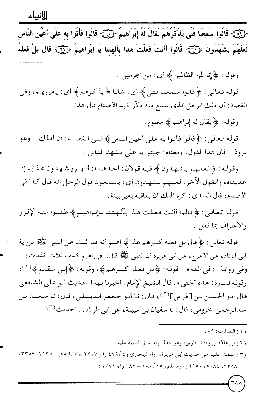قَوْله تَعَالَى: {قَالَ بل فعله كَبِيرهمْ هَذَا} اعْلَم أَنه قد ثَبت عَن النَّبِي بِرِوَايَة أبي الزِّنَاد، عَن الْأَعْرَج، عَن أبي هُرَيْرَة أَن النَّبِي قَالَ: " إِبْرَاهِيم كذب ثَلَاث كذبات " - وَفِي رِوَايَة: " فِي الله " - قَوْله: {بل فعله كَبِيرهمْ} ، وَقَوله: {إِنِّي سقيم} ، وَقَوله لسارة: هَذِه أُخْتِي ". قَالَ الشَّيْخ الإِمَام: أخبرنَا بِهَذَا الحَدِيث أَبُو عَليّ الشَّافِعِي قَالَ أَبُو الْحسن بن [فراس] ، قَالَ: نَا أَبُو جَعْفَر الديبلي، قَالَ: نَا سعيد بن عبد الرَّحْمَن المَخْزُومِي، قَالَ: نَا سُفْيَان بن عُيَيْنَة، عَن أبي الزِّنَاد. . الحَدِيث.