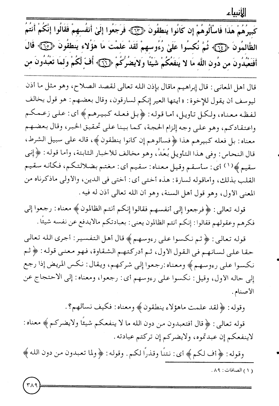 {كَبِيرهمْ هَذَا فاسألوهم إِن كَانُوا ينطقون (63) فَرَجَعُوا إِلَى أنفسهم فَقَالُوا إِنَّكُم أَنْتُم الظَّالِمُونَ (64) ثمَّ نكسوا على رُءُوسهم لقد علمت مَا هَؤُلَاءِ ينطقون (65) قَالَ أفتعبدون من دون الله مَا لَا ينفعكم شَيْئا وَلَا يضركم (66) أُفٍّ لكم وَلما تَعْبدُونَ من} قَالَ أهل الْمعَانِي: قَالَ إِبْرَاهِيم مَا قَالَ بِإِذن الله تَعَالَى لقصد الصّلاح، وَهُوَ مثل مَا أذن ليوسف أَن يَقُول للإخوة: " أيتها العير إِنَّكُم لسارقون، وَقَالَ بَعضهم، هُوَ قَول يُخَالف لَفظه مَعْنَاهُ، وَلكُل تَأْوِيل، أما قَوْله: {بل فعله كَبِيرهمْ} أَي: على زعمكم واعتقادكم، وَهُوَ على وَجه إِلْزَام الْحجَّة، كَمَا بَينا على تَحْقِيق الْخَبَر، وَقَالَ بَعضهم مَعْنَاهُ: بل فعله كَبِيرهمْ هَذَا {فَسَأَلُوهُمْ إِن كَانُوا ينطقون} ، قَالَه على سَبِيل الشَّرْط، قَالَ النّحاس: وَفِي هَذَا التَّأْوِيل بعد، وَهُوَ مُخَالف للْأَخْبَار الثَّابِتَة، وَأما قَوْله: {إِنِّي سقيم} أَي: سأسقم وَقيل مَعْنَاهُ: سقيم أَي: مُغْتَم بضلالتكم، فَكَأَنَّهُ سقيم الْقلب بذلك، وَأما قَوْله لسارة: هَذِه أُخْتِي أَي: أُخْتِي فِي الدّين، وَالْأولَى مَا ذَكرْنَاهُ من الْمَعْنى الأول، وَهُوَ قَول أهل السّنة، وَهُوَ أَن الله تَعَالَى أذن لَهُ فِيهِ.