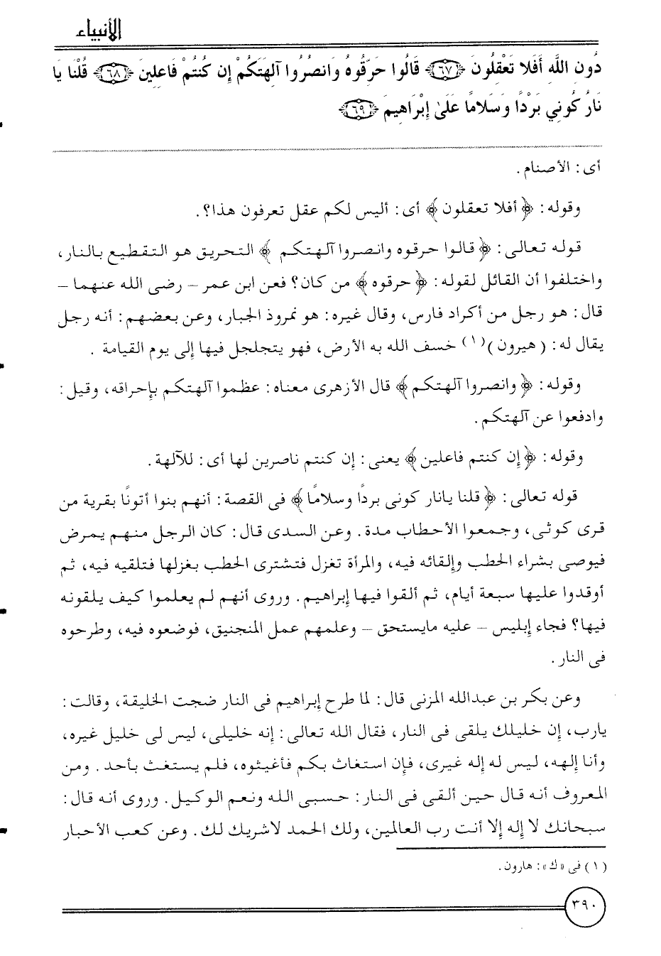 {دون الله أَفلا تعقلون (67) قَالُوا حرقوه وانصروا آلِهَتكُم إِن كُنْتُم فاعلين (68) قُلْنَا يَا نَار كوني بردا وَسلَامًا على إِبْرَاهِيم (69) } أَي: الْأَصْنَام.