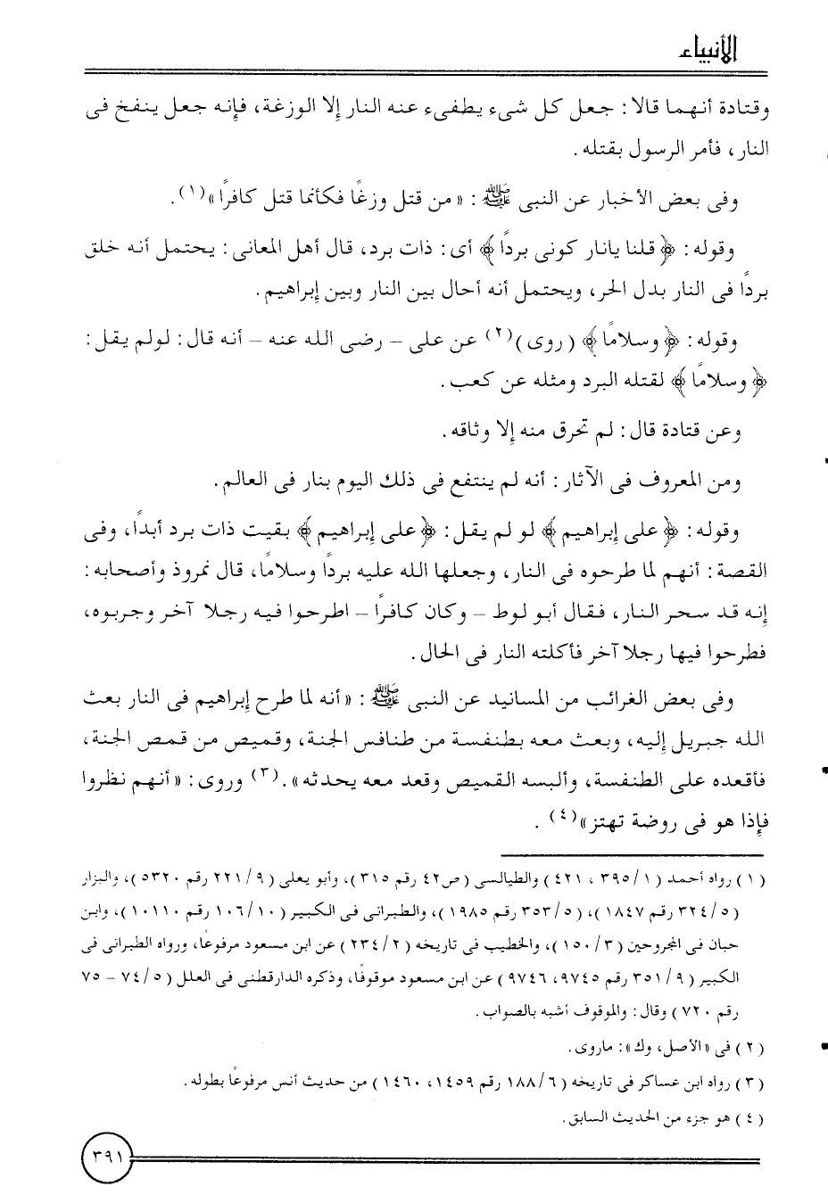 وَفِي بعض الغرائب من المسانيد عَن النَّبِي: " أَنه لما طرح إِبْرَاهِيم فِي النَّار بعث الله جِبْرِيل إِلَيْهِ، وَبعث مَعَه بطنفسة من طنافس الْجنَّة، وقميص من قمص الْجنَّة، فأقعده على الطفنسة، وَألبسهُ الْقَمِيص وَقعد مَعَه يحدثه ". وَرُوِيَ: " أَنهم نظرُوا فَإِذا هُوَ فِي رَوْضَة تهتز ".