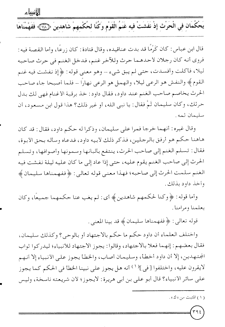 وَاخْتلف الْعلمَاء أَن دَاوُد حكم مَا حكم بِالِاجْتِهَادِ أَو بِالْوَحْي؟ وَكَذَلِكَ سُلَيْمَان، فَقَالَ بَعضهم: إنَّهُمَا فعلا بِالِاجْتِهَادِ، وَقَالُوا: يجوز الِاجْتِهَاد للأنبياء؛ ليدركوا ثَوَاب الْمُجْتَهدين، إِلَّا أَن دَاوُد أَخطَأ، وَسليمَان أصَاب، وَالْخَطَأ يجوز على الْأَنْبِيَاء إِلَّا أَنهم لَا يقرونَ عَلَيْهِ، وَاخْتلفُوا [فِي] أَنه هَل يجوز على نَبينَا الْخَطَأ فِي الحكم كَمَا يجوز على سَائِر الْأَنْبِيَاء؟ قَالَ أَبُو عَليّ بن أبي هُرَيْرَة: لَا يجوز؛ لِأَن شَرِيعَته ناسخة، وَلَيْسَ