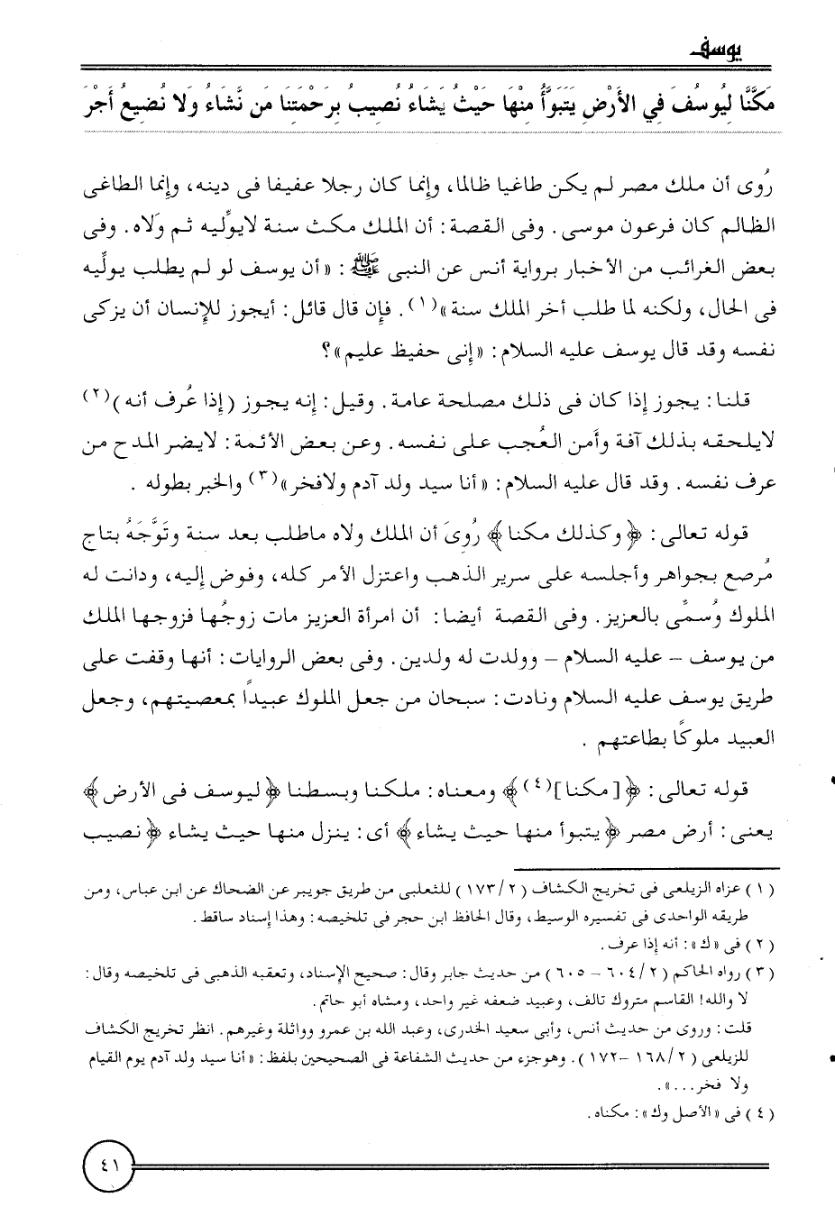 {مكنا ليوسف فِي الأَرْض يتبوأ مِنْهَا حَيْثُ يَشَاء نصيب برحمتنا من نشَاء وَلَا نضيع أجر} رُوِيَ أَن ملك مصر لم يكن طاغيا ظَالِما، وَإِنَّمَا كَانَ رجلا عفيفا فِي دينه، وَإِنَّمَا الطاغي الظَّالِم كَانَ فِرْعَوْن مُوسَى. وَفِي الْقِصَّة: أَن الْملك مكث سنة لَا يوليه ثمَّ ولاه. وَفِي بعض الغرائب من الْأَخْبَار بِرِوَايَة أنس عَن النَّبِي: " أَن يُوسُف لَو لم يطْلب يوليه فِي الْحَال، وَلكنه لما طلب أخر الْملك سنة ". فَإِن قَالَ قَائِل: أَيجوزُ للْإنْسَان أَن يُزكي نَفسه وَقد قَالَ يُوسُف عَلَيْهِ السَّلَام: " إِنِّي حفيظ عليم "؟