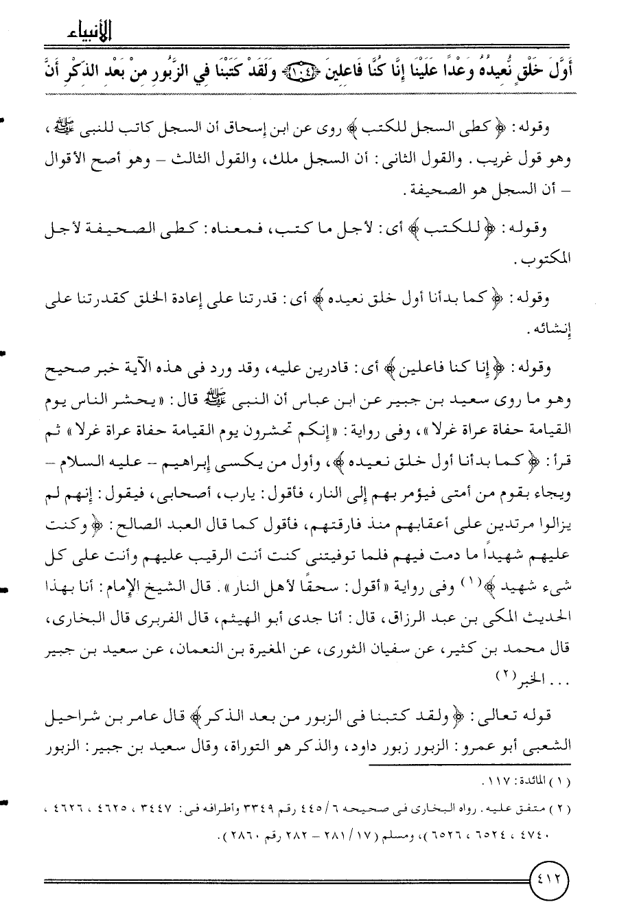وَقَوله: {إِنَّا كُنَّا فاعلين} أَي: قَادِرين عَلَيْهِ، وَقد ورد فِي هَذِه الْآيَة خبر صَحِيح وَهُوَ مَا روى سعيد بن جُبَير عَن ابْن عَبَّاس أَن النَّبِي قَالَ: " يحْشر النَّاس يَوْم الْقِيَامَة حُفَاة عُرَاة غرلًا "، وَفِي رِوَايَة: " إِنَّكُم تحشرون يَوْم الْقِيَامَة حُفَاة عُرَاة غرلًا " ثمَّ قَرَأَ: {كَمَا بدأنا أول خلق نعيده} ، وَأول من يكسى إِبْرَاهِيم - عَلَيْهِ السَّلَام - ويجاء بِقوم من أمتِي فَيُؤْمَر بهم إِلَى النَّار، فَأَقُول: يَا رب، أَصْحَابِي، فَيَقُول: إِنَّهُم لم يزَالُوا مرتدين على أَعْقَابهم مُنْذُ فَارَقْتهمْ، فَأَقُول كَمَا قَالَ العَبْد الصَّالح: {وَكنت عَلَيْهِم شَهِيدا مَا دمت فيهم فَلَمَّا توفيتني كنت أَنْت الرَّقِيب عَلَيْهِم وَأَنت على كل شَيْء شَهِيد} وَفِي رِوَايَة " أَقُول: سحقا لأهل النَّار ". قَالَ الشَّيْخ الإِمَام: أَنا بِهَذَا الحَدِيث الْمَكِّيّ بن عبد الرَّزَّاق، قَالَ: أَنا جدي أَبُو الْهَيْثَم، قَالَ الْفربرِي قَالَ البُخَارِيّ، قَالَ مُحَمَّد بن كثير، عَن سُفْيَان الثَّوْريّ، عَن الْمُغيرَة بن النُّعْمَان، عَن سعيد بن جُبَير ... الْخَبَر.