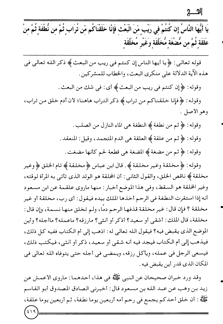 {يَا أَيهَا النَّاس إِن كُنْتُم فِي ريب من الْبَعْث فَإنَّا خَلَقْنَاكُمْ من تُرَاب ثمَّ من نُطْفَة ثمَّ من علقَة ثمَّ من مُضْغَة مخلقة وَغير مخلقة}