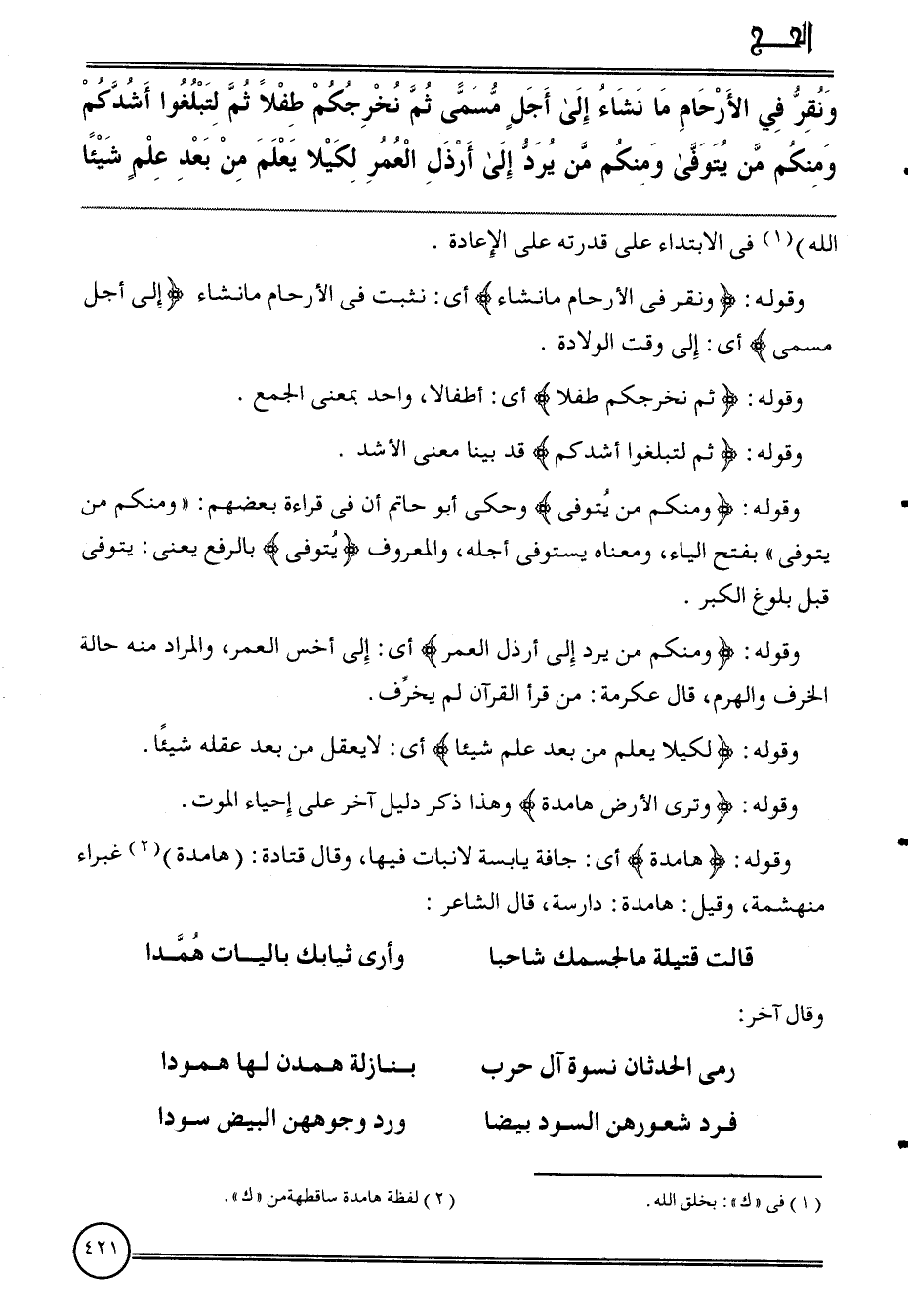{ونقر فِي الْأَرْحَام مَا نشَاء إِلَى أجل مُسَمّى ثمَّ نخرجكم طفْلا ثمَّ لتبلغوا أَشدّكُم ومنكم من يتوفى ومنكم من يرد إِلَى أرذل الْعُمر لكيلا يعلم من بعد علم شَيْئا} الله) فِي الِابْتِدَاء على قدرته على الْإِعَادَة.
