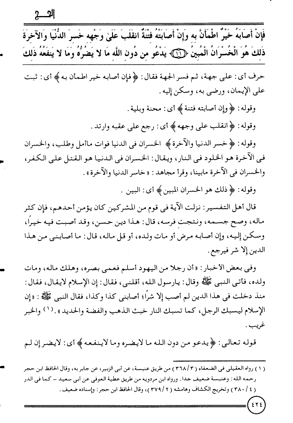 قَالَ أهل التَّفْسِير: نزلت الْآيَة فِي قوم من الْمُشْركين كَانَ يُؤمن أحدهم، فَإِن كثر مَاله، وَصَحَّ جِسْمه، ونتجت فرسه، قَالَ: هَذَا دين حسن، وَقد أصبت فِيهِ خيرا، وَسكن إِلَيْهِ، وَإِن أَصَابَهُ مرض أَو مَاتَ وَلَده، أَو قل مَاله، قَالَ: مَا أصابني من هَذَا الدّين إِلَّا شَرّ فَيرجع.
