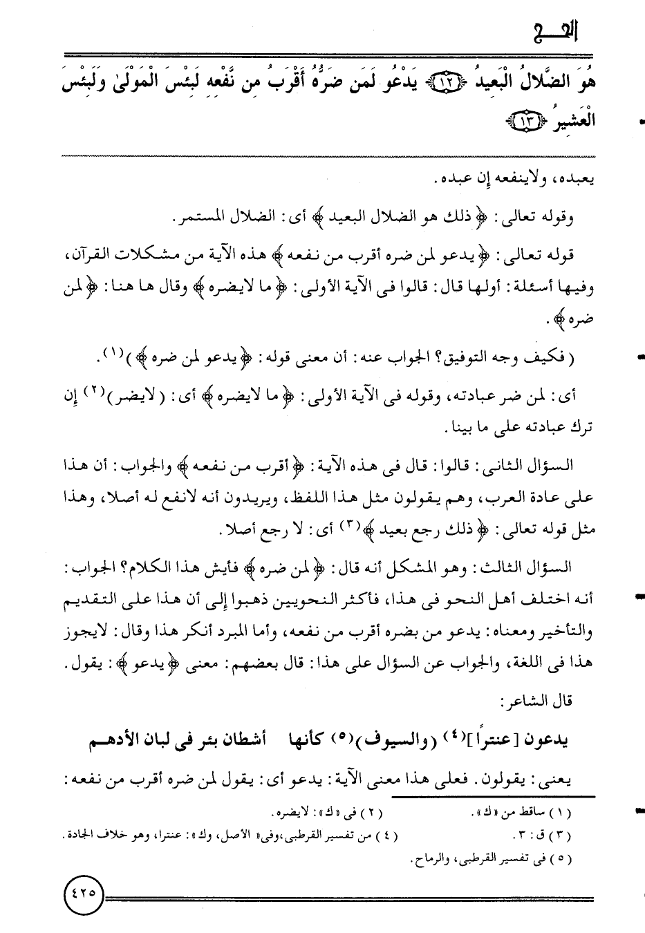قَوْله تَعَالَى: {يَدْعُو لمن ضره أقرب من نَفعه} هَذِه الْآيَة من مشكلات الْقُرْآن، وفيهَا أسئلة: أَولهَا قَالَ: قَالُوا فِي الْآيَة الأولى: {مَا لَا يضرّهُ} وَقَالَ هَاهُنَا: {لمن ضره} .