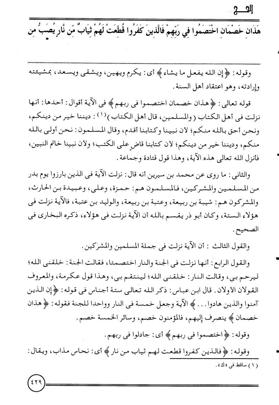 قَوْله تَعَالَى: {هَذَانِ خصمان اخْتَصَمُوا فِي رَبهم} فِي الْآيَة أَقْوَال: أَحدهَا: أَنَّهَا نزلت فِي أهل الْكتاب (وَالْمُسْلِمين، قَالَ أهل الْكتاب) : ديننَا خير من دينكُمْ، وَنحن أَحَق بِاللَّه مِنْكُم؛ لِأَن نَبينَا وَكِتَابنَا أقدم، وَقَالَ الْمُسلمُونَ: نَحن أولى بِاللَّه مِنْكُم، وَدِيننَا خير من دينكُمْ؛ لِأَن كتَابنَا قَاض على الْكتب؛ وَلِأَن نَبينَا خَاتم النَّبِيين، فَأنْزل الله تَعَالَى هَذِه الْآيَة، وَهَذَا قَول قَتَادَة وَجَمَاعَة.