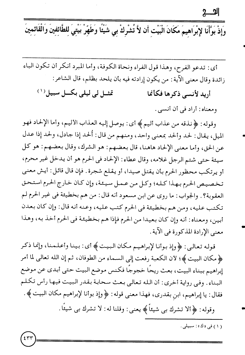 قَوْله تَعَالَى: {وَإِذ بوأنا لإِبْرَاهِيم مَكَان الْبَيْت} أَي: بَينا وَأَعْلَمنَا، وَإِنَّمَا ذكر {مَكَان الْبَيْت} ؛ لِأَن الْكَعْبَة رفعت إِلَى السَّمَاء من الطوفان، ثمَّ إِن الله تَعَالَى لما أَمر إِبْرَاهِيم بِبِنَاء الْبَيْت، بعث ريحًا خجوجا فكنس مَوضِع الْبَيْت حَتَّى أبدى عَن مَوضِع الْبناء. وَفِي رِوَايَة أُخْرَى: أَن الله تَعَالَى بعث سَحَابَة بِقدر الْبَيْت فِيهَا رَأس تكلم فَقَالَ: يَا إِبْرَاهِيم، ابْن بقدري، فَهَذَا معنى قَوْله: {وَإِذ بوأنا لإِبْرَاهِيم مَكَان الْبَيْت} .