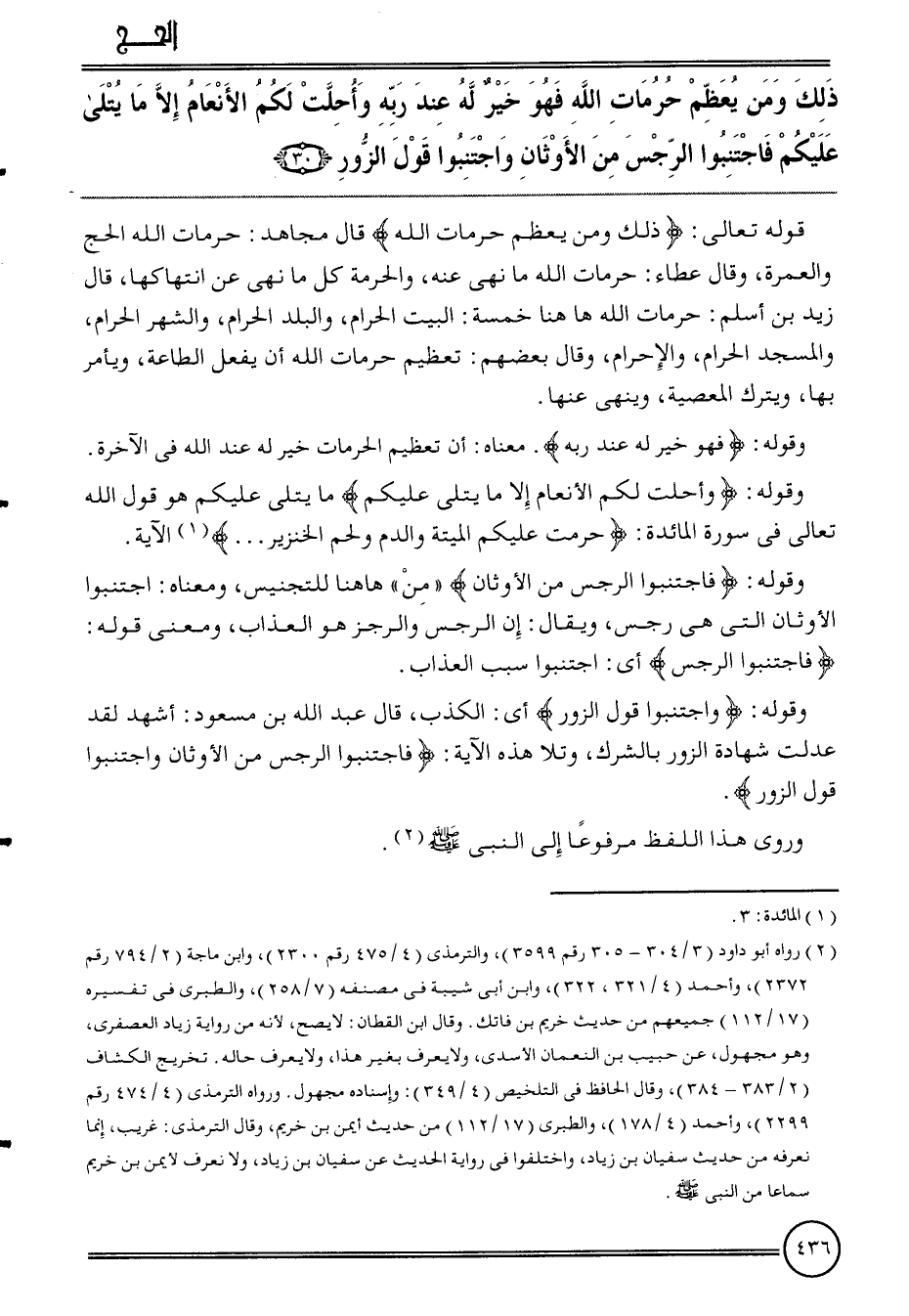 {ذَلِك وَمن يعظم حرمات الله فَهُوَ خير لَهُ عِنْد ربه وَأحلت لكم الْأَنْعَام إِلَّا مَا يُتْلَى عَلَيْكُم فاجتنوا الرجس من الْأَوْثَان وَاجْتَنبُوا قَول الزُّور (30) }