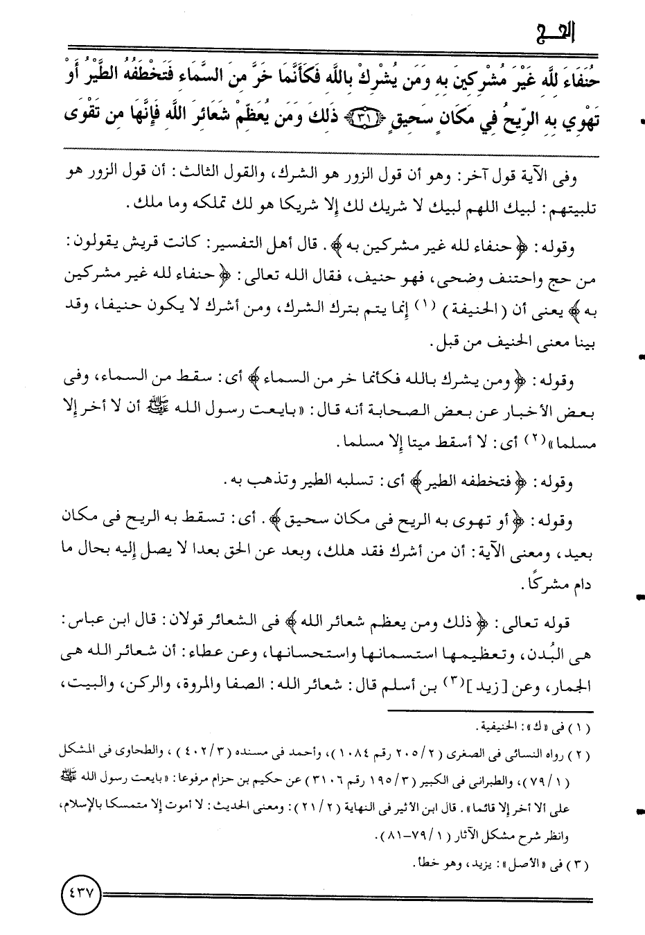 {حنفَاء لله غير مُشْرِكين بِهِ وَمن يُشْرك بِاللَّه فَكَأَنَّمَا خر من السَّمَاء فتخطفه الطير أَو تهوي بِهِ الرّيح فِي مَكَان سحيق (31) ذَلِك وَمن يعظم شَعَائِر الله فَإِنَّهَا من تقوى}