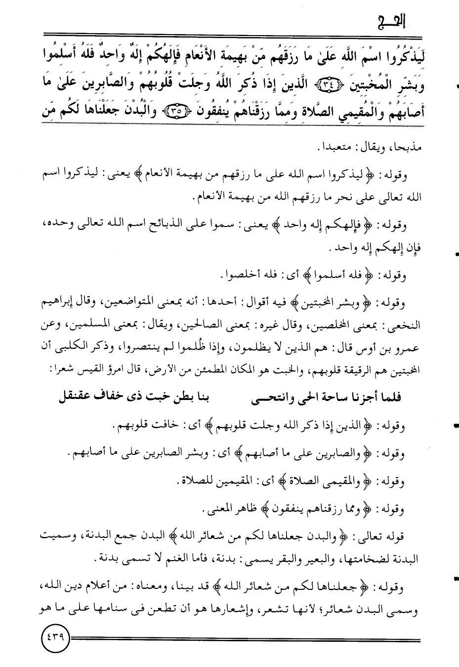 {لِيذكرُوا اسْم الله على مَا رزقهم من بَهِيمَة الْأَنْعَام فإلهكم إِلَه وَاحِد فَلهُ أَسْلمُوا وَبشر المخبتين (34) الَّذين إِذا ذكر الله وجلت قُلُوبهم وَالصَّابِرِينَ على مَا أَصَابَهُم والمقيمي الصَّلَاة وَمِمَّا رَزَقْنَاهُمْ يُنْفقُونَ (35) وَالْبدن جعلناها لكم من} مذبحا، وَيُقَال: متعبدا.