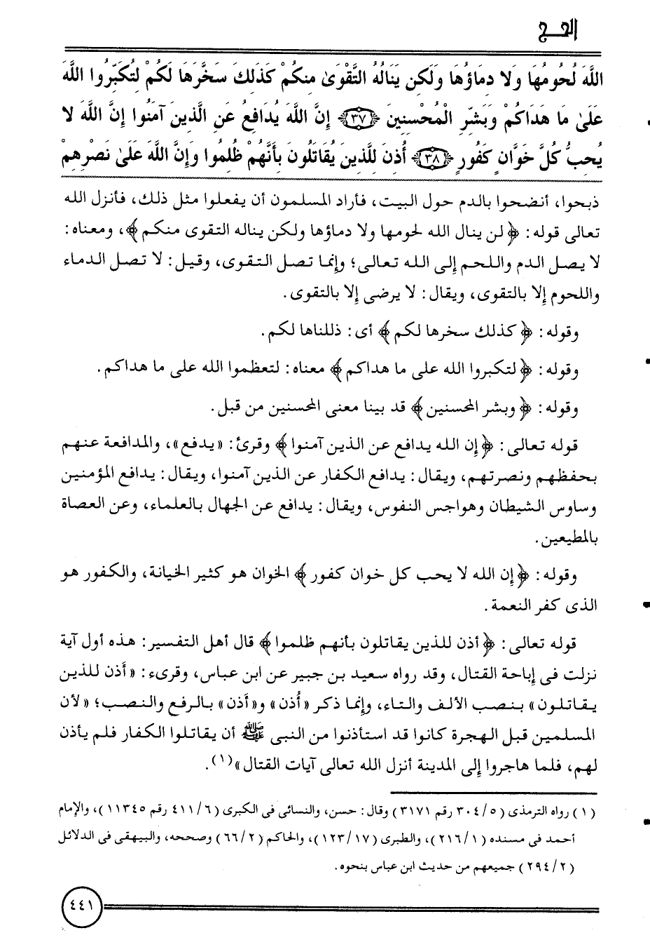 {الله لحومها وَلَا دماؤها وَلَكِن يَنَالهُ التَّقْوَى مِنْكُم كَذَلِك سخرها لكم لتكبروا الله على مَا هدَاكُمْ وَبشر الْمُحْسِنِينَ (37) إِن الله يدافع عَن الَّذين آمنُوا إِن الله لَا يحب كل خوان كفور (38) أذن للَّذين يُقَاتلُون بِأَنَّهُم ظلمُوا وَإِن الله على نَصرهم} ذَبَحُوا، أنضحوا بِالدَّمِ حول الْبَيْت، فَأَرَادَ الْمُسلمُونَ أَن يَفْعَلُوا مثل ذَلِك، فَأنْزل الله تَعَالَى قَوْله: {لن ينَال الله لحومها وَلَا دماؤها وَلَكِن يَنَالهُ التَّقْوَى مِنْكُم} ، وَمَعْنَاهُ: لَا يصل الدَّم وَاللَّحم إِلَى الله تَعَالَى؛ وَإِنَّمَا تصل التَّقْوَى، وَقيل: لَا تصل الدِّمَاء واللحوم إِلَّا بالتقوى، وَيُقَال: لَا يرضى إِلَّا بالتقوى.