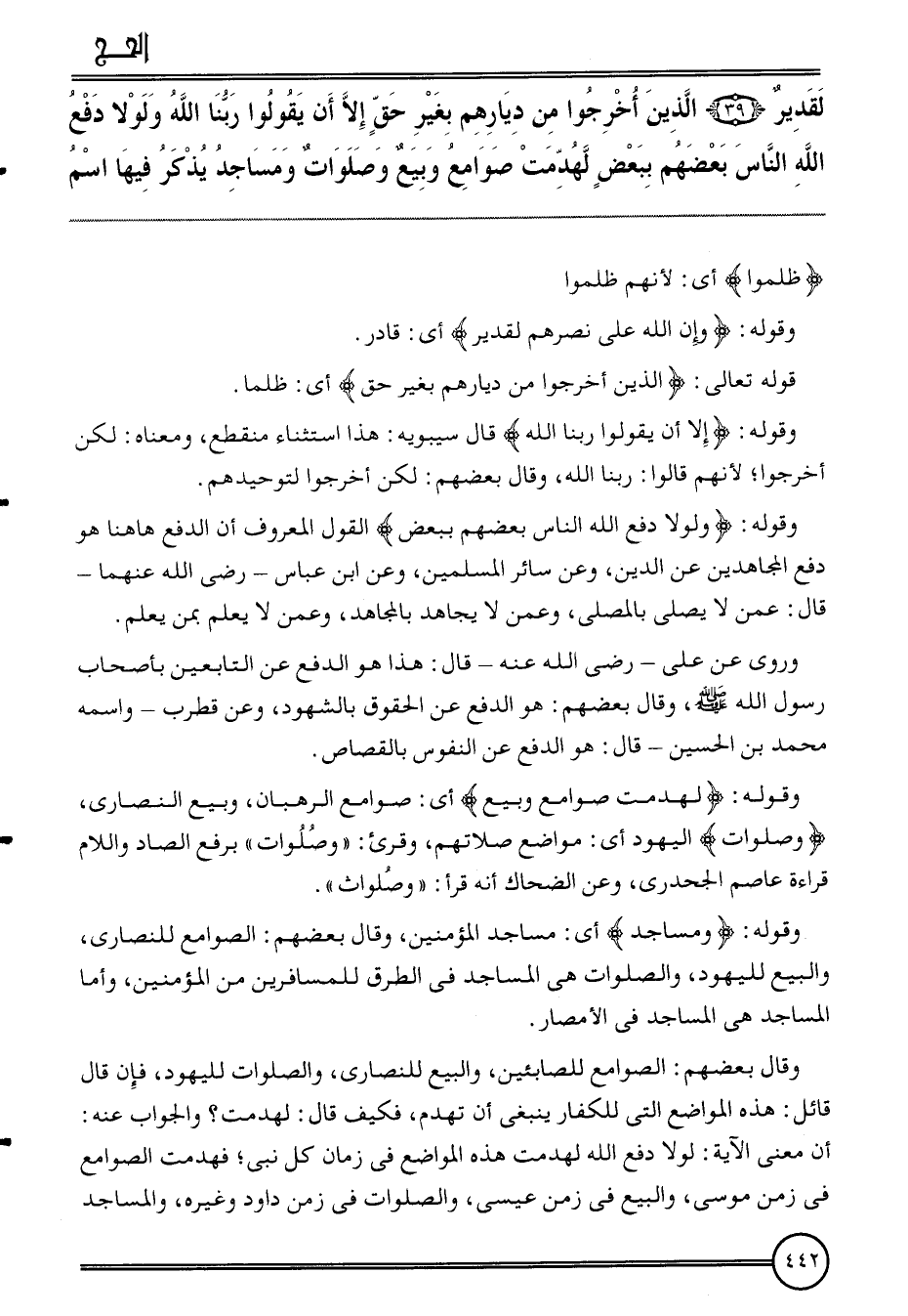 {لقدير (39) الَّذين أخرجُوا من دِيَارهمْ بِغَيْر حق إِلَّا أَن يَقُولُوا رَبنَا الله وَلَوْلَا دفع الله النَّاس بَعضهم بِبَعْض لهدمت صوامع وَبيع وصلوات ومساجد يذكر فِيهَا اسْم} {ظلمُوا} أَي: لأَنهم ظلمُوا.