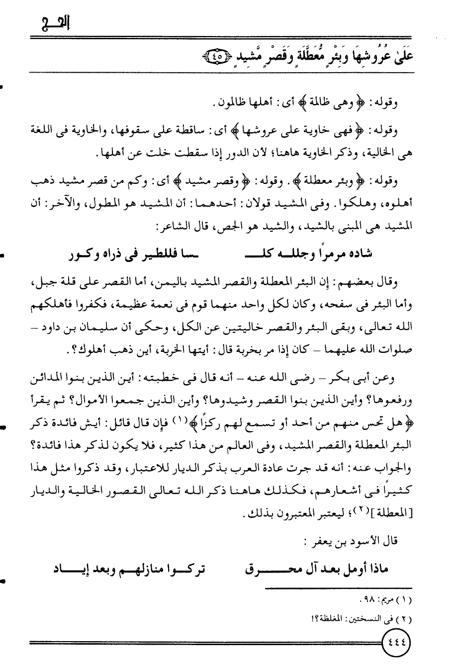 وَقَوله: {وبئر معطلة} . وَقَوله: {وَقصر مشيد} أَي: وَكم من قصر مشيد ذهب أهلوه، وهلكوا. وَفِي المشيد قَولَانِ: أَحدهمَا: أَن المشيد هُوَ المطول، وَالْآخر: أَن المشيد هِيَ الْمَبْنِيّ بالشيد، والشيد هُوَ الجص، قَالَ الشَّاعِر: