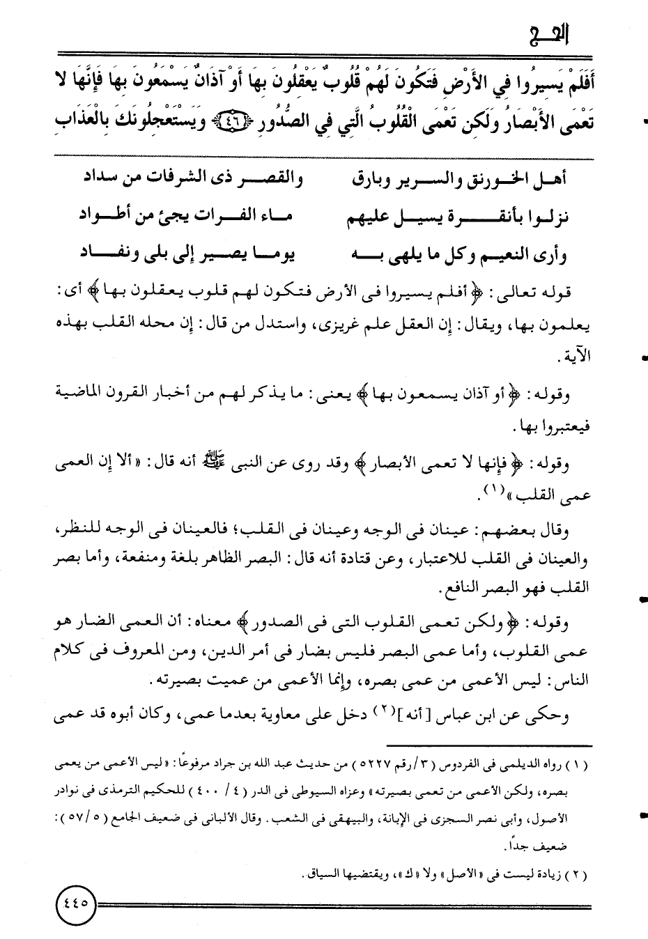 {أفلم يسروا فِي الأَرْض فَتكون لَهُم قُلُوب يعْقلُونَ بهَا أَو آذان يسمعُونَ بهَا فَإِنَّهَا لَا تعمى الْأَبْصَار وَلَكِن تعمى الْقُلُوب الَّتِي فِي الصُّدُور (46) ويستعجلونك بِالْعَذَابِ}
