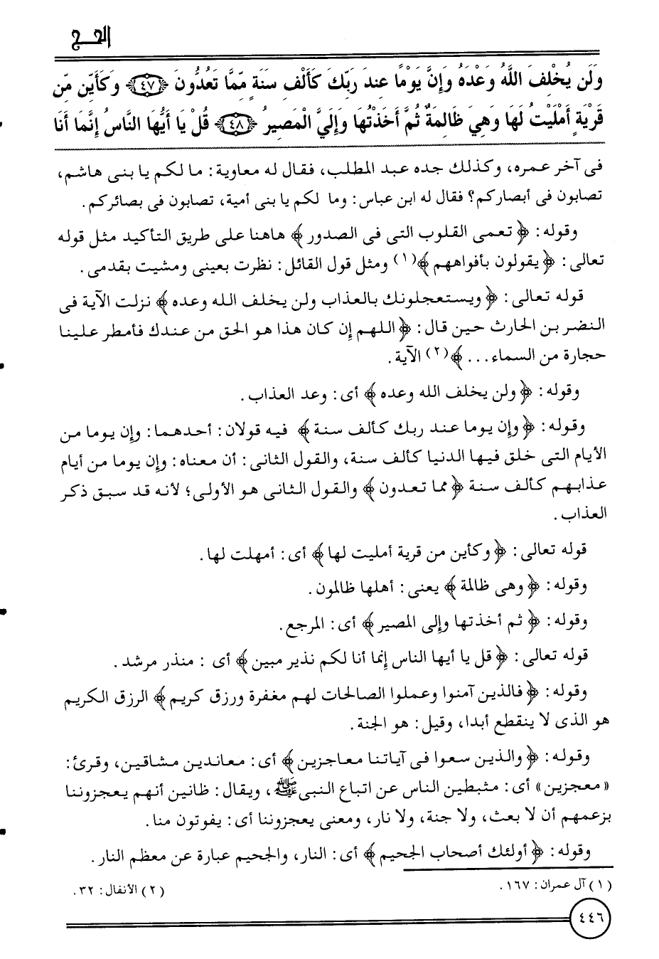 {وَلنْ يخلف الله وعده وَإِن يَوْمًا عِنْد رَبك كألف سنة مِمَّا تَعدونَ (47) وكأين من قَرْيَة أمليت لَهَا وَهِي ظالمة ثمَّ أَخَذتهَا وإلي الْمصير (48) قل يَا أَيهَا النَّاس إِنَّمَا أَنا} فِي آخر عمره، وَكَذَلِكَ جده عبد الْمطلب، فَقَالَ لَهُ مُعَاوِيَة: مَا لكم يَا بني هَاشم، تصابون فِي أبصاركم؟ فَقَالَ لَهُ ابْن عَبَّاس: وَمَا لكم يَا بني أُميَّة، تصابون فِي بصائركم.