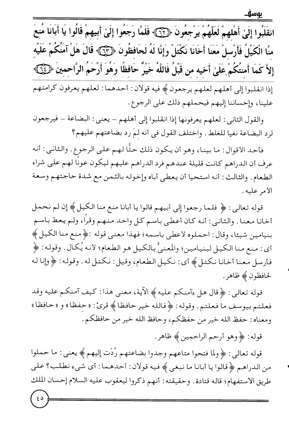 {انقلوا إِلَى أهلهم لَعَلَّهُم يرجعُونَ (62) فَلَمَّا رجعُوا إِلَى أَبِيهِم قَالُوا يَا أَبَانَا منع منا الْكَيْل فَأرْسل مَعنا أخانا نكتل وَإِنَّا لَهُ لحافظون (63) قَالَ هَل آمنكم عَلَيْهِ إِلَّا كَمَا أمنتكم على أَخِيه من قبل فَالله خير حَافِظًا وَهُوَ أرْحم الرَّاحِمِينَ (64) } إِذا انقلبوا إِلَى أهلهم لَعَلَّهُم يرجعُونَ) فِيهِ قَولَانِ: أَحدهمَا: لَعَلَّهُم يعْرفُونَ كرامتهم علينا، وإحساننا إِلَيْهِم فيحملهم ذَلِك على الرُّجُوع.