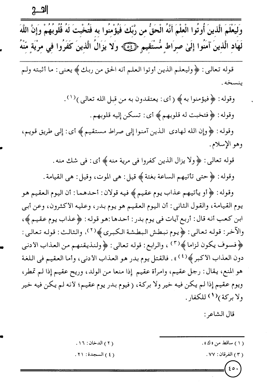 {وليعلم الَّذين أُوتُوا الْعلم أَنه الْحق من رَبك فيؤمنوا بِهِ فتخبت لَهُ قُلُوبهم وَإِن الله لهاد الَّذين آمنُوا إِلَى صِرَاط مُسْتَقِيم (54) وَلَا يزَال الَّذين كفرُوا فِي مرية مِنْهُ}