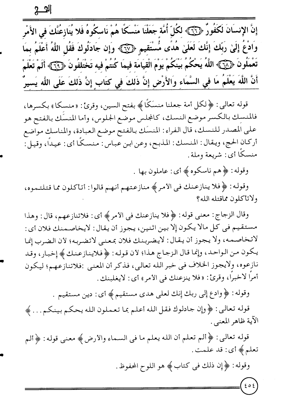 {إِن الْإِنْسَان لكفور (66) لكل أمة جعلنَا منسكا هم ناسكوه فَلَا ينازعنك فِي الْأَمر وادع إِلَى رَبك إِنَّك لعلى هدى مُسْتَقِيم (67) وَإِن جادلوك فَقل الله أعلم بِمَا تَعْمَلُونَ (68) الله يحكم بَيْنكُم يَوْم الْقِيَامَة فِيمَا كُنْتُم فِيهِ تختلفون (69) ألم تعلم أَن الله يعلم مَا فِي السَّمَاء وَالْأَرْض إِن ذَلِك فِي كتاب إِن ذَلِك على الله يسير}