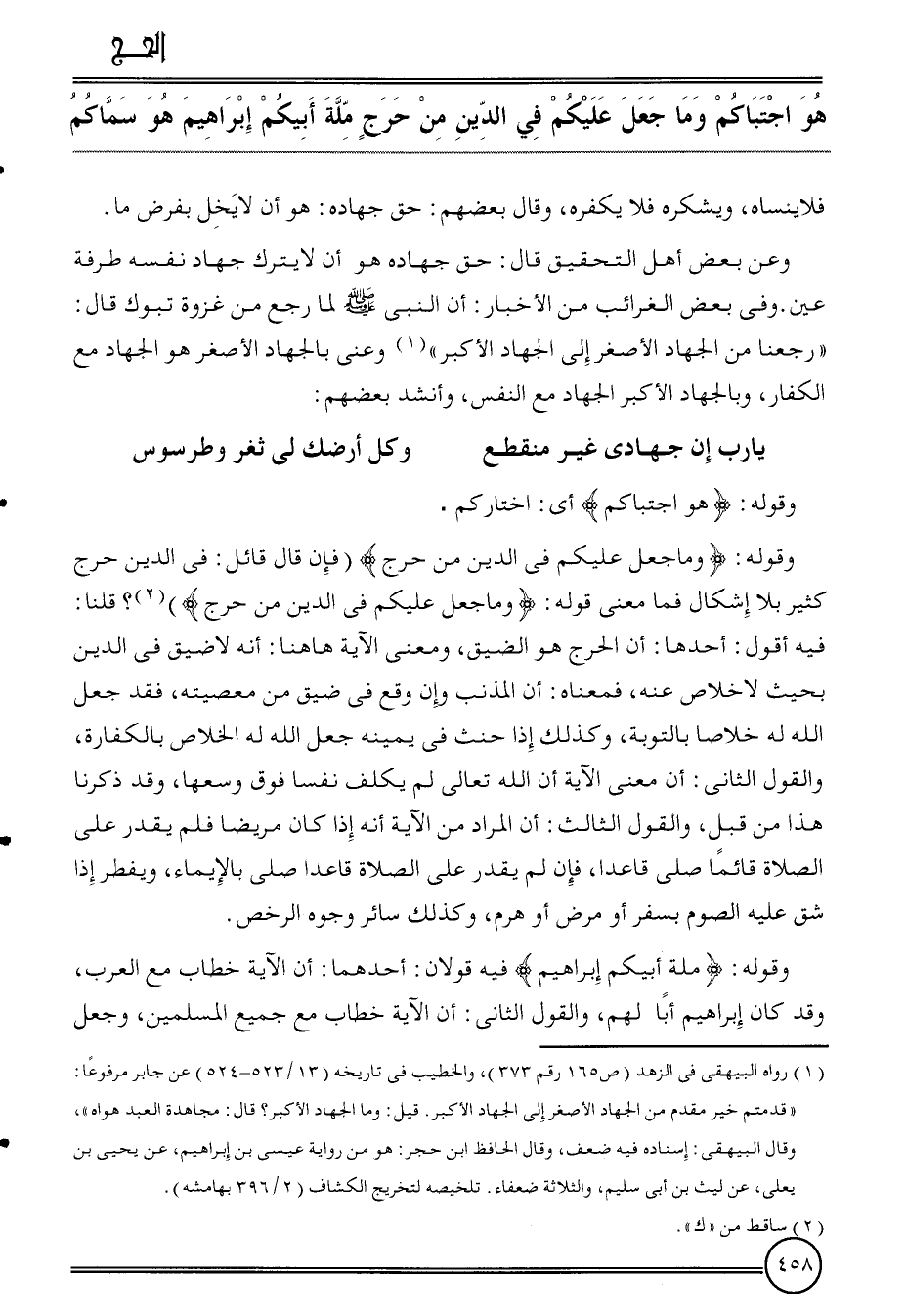 وَعَن بعض أهل التَّحْقِيق قَالَ: حق جهاده هُوَ أَن لَا يتْرك جِهَاد نَفسه طرفَة عين. وَفِي بعض الغرائب من الْأَخْبَار: أَن النَّبِي لما رَجَعَ من غَزْوَة تَبُوك قَالَ: " رَجعْنَا من الْجِهَاد الْأَصْغَر إِلَى الْجِهَاد الْأَكْبَر " وعنى بِالْجِهَادِ الْأَصْغَر هُوَ الْجِهَاد مَعَ الْكفَّار، وبالجهاد الْأَكْبَر الْجِهَاد مَعَ النَّفس، وَأنْشد بَعضهم.