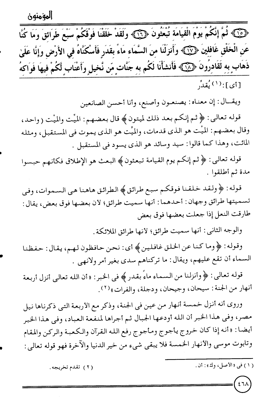 ( {15) ثمَّ إِنَّكُم يَوْم الْقِيَامَة تبعثون (16) وَلَقَد خلقنَا فَوْقكُم سبع طرائق وَمَا كُنَّا عَن الْخلق غافلين (17) وأنزلنا من السَّمَاء مَاء بِقدر فأسكناه فِي الأَرْض وَإِنَّا على ذهَاب بِهِ لقادرون (18) فأنشأنا لكم بِهِ جنَّات من نخيل وأعناب لكم فِيهَا فواكه}
