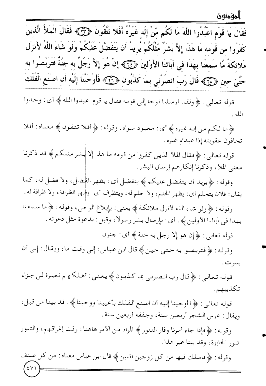 {فَقَالَ يَا قوم اعبدوا الله مَا لكم من إِلَه غَيره أَفلا تَتَّقُون (23) فَقَالَ الْمَلأ الَّذين كفرُوا من قومه مَا هَذَا إِلَّا بشر مثلكُمْ يُرِيد أَن يتفضل عَلَيْكُم وَلَو شَاءَ الله لأنزل مَلَائِكَة مَا سمعنَا بِهَذَا فِي آبَائِنَا الْأَوَّلين (24) إِن هُوَ إِلَّا رجل بِهِ جنَّة فتربصوا بِهِ حَتَّى حِين (25) قَالَ رب انصرني بِمَا كذبون (26) فأوحينا إِلَيْهِ أَن اصْنَع الْفلك}