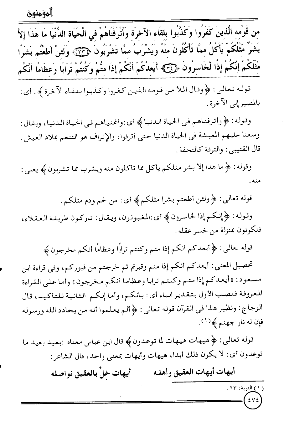 {من قومه الَّذين كفرُوا وكذبوا بلقاء الْآخِرَة وأترفناهم فِي الْحَيَاة الدُّنْيَا مَا هَذَا إِلَّا بشر مثلكُمْ يَأْكُل مِمَّا تَأْكُلُونَ مِنْهُ وَيشْرب مِمَّا تشربون (33) وَلَئِن أطعتم بشرا مثلكُمْ إِنَّكُم إِذا لخاسرون (34) أيعدكم أَنكُمْ إِذا متم وكنتم تُرَابا وعظاما أَنكُمْ}