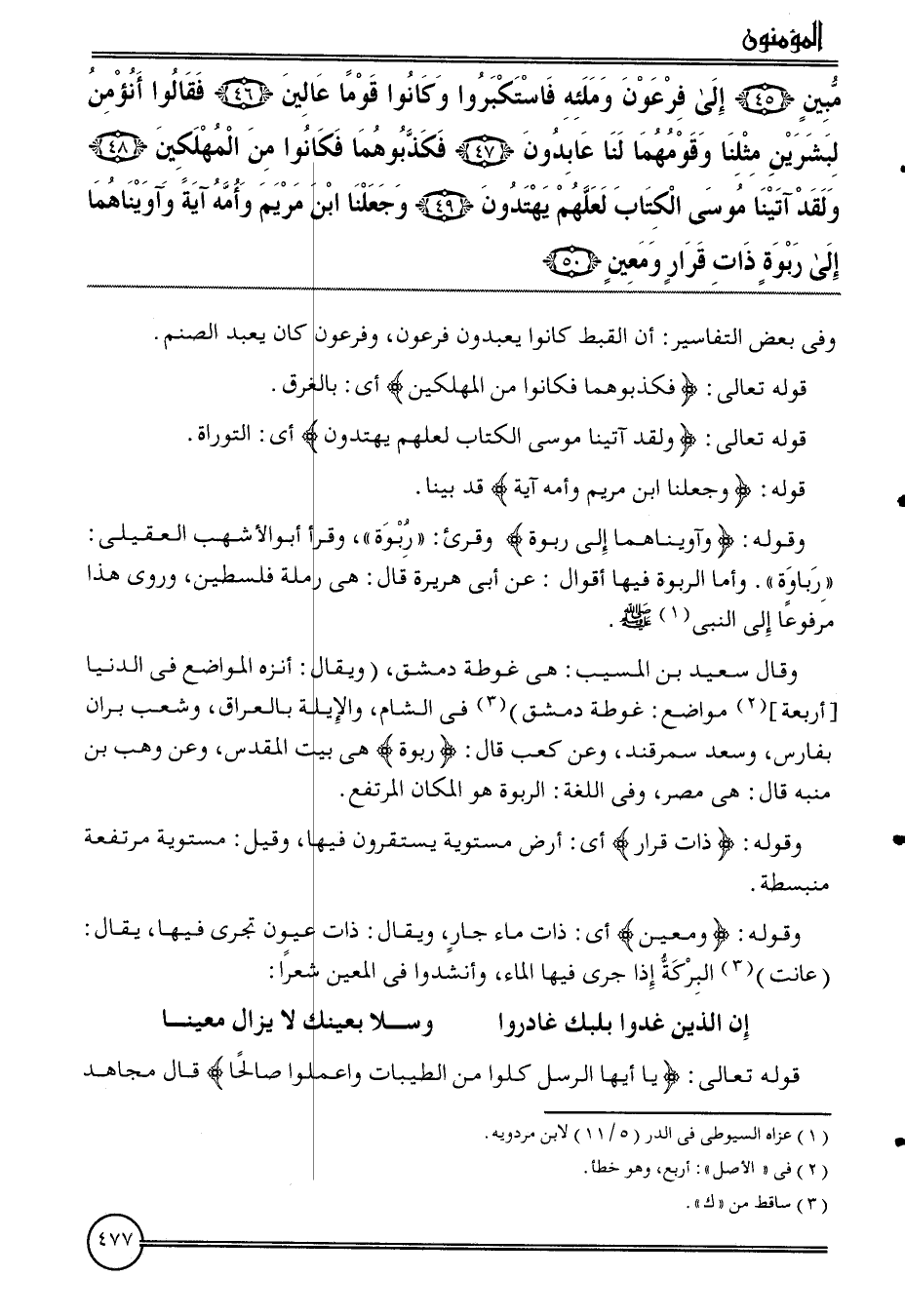 {مُبين (45) إِلَى فِرْعَوْن وملئه فاستكبروا وَكَانُوا قوما عالين (46) فَقَالُوا أنؤمن لبشرين مثلنَا وقومهما لنا عَابِدُونَ (47) فكذبوهما فَكَانُوا من المهلكين (48) وَلَقَد آتَيْنَا مُوسَى الْكتاب لَعَلَّهُم يَهْتَدُونَ (49) وَجَعَلنَا ابْن مَرْيَم وَأمه آيَة وآويناهما إِلَى ربوة ذَات قَرَار ومعين (50) } وَفِي بعض التفاسير: أَن القبط كَانُوا يعْبدُونَ فِرْعَوْن، وَفرْعَوْن كَانَ يعبد الصَّنَم.