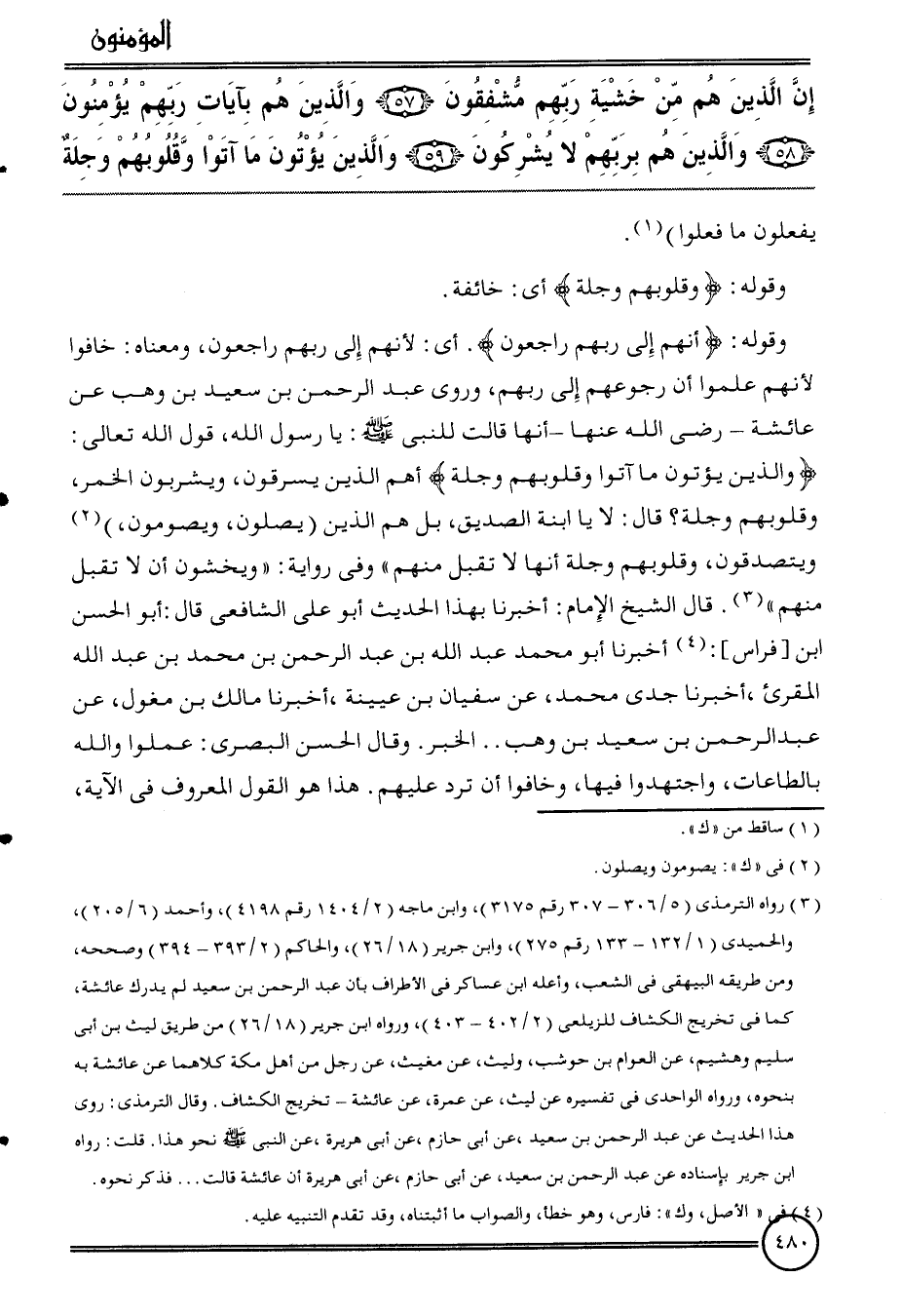 {إِن الَّذين هم من خشيَة رَبهم مشفقون (57) وَالَّذين هم بآيَات رَبهم يُؤمنُونَ (58) وَالَّذين هم برَبهمْ لَا يشركُونَ (59) وَالَّذين يُؤْتونَ مَا آتوا وَقُلُوبهمْ وَجلة} يَفْعَلُونَ مَا فعلوا) .