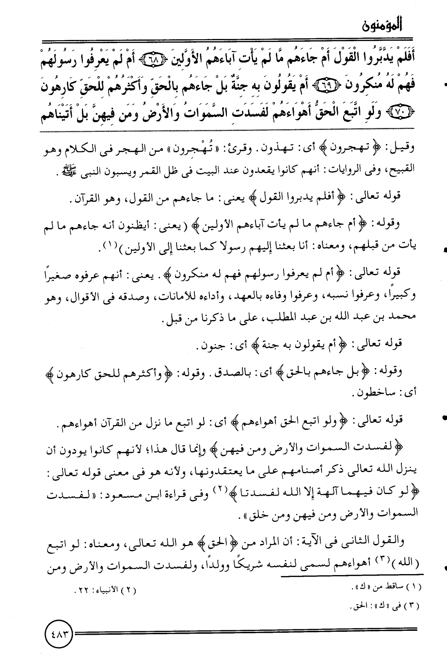 {أفلم يدبروا القَوْل أم جَاءَهُم مَا لم يَأْتِ آبَاءَهُم الْأَوَّلين (68) أم لم يعرفوا رسولهم فهم لَهُ منكرون (69) أم يَقُولُونَ بِهِ جنَّة بل جَاءَهُم بِالْحَقِّ وَأَكْثَرهم للحق كَارِهُون (70) وَلَو اتبع الْحق أهواءهم لفسدت السَّمَوَات وَالْأَرْض وَمن فِيهِنَّ بل أتيناهم} وَقيل: {تهجرون} أَي: تهذون. وقرىء: " تهجرون " من الهجر فِي الْكَلَام وَهُوَ الْقَبِيح، وَفِي الرِّوَايَات: أَنهم كَانُوا يَقْعُدُونَ عِنْد الْبَيْت فِي ظلّ الْقَمَر ويسبون النَّبِي.