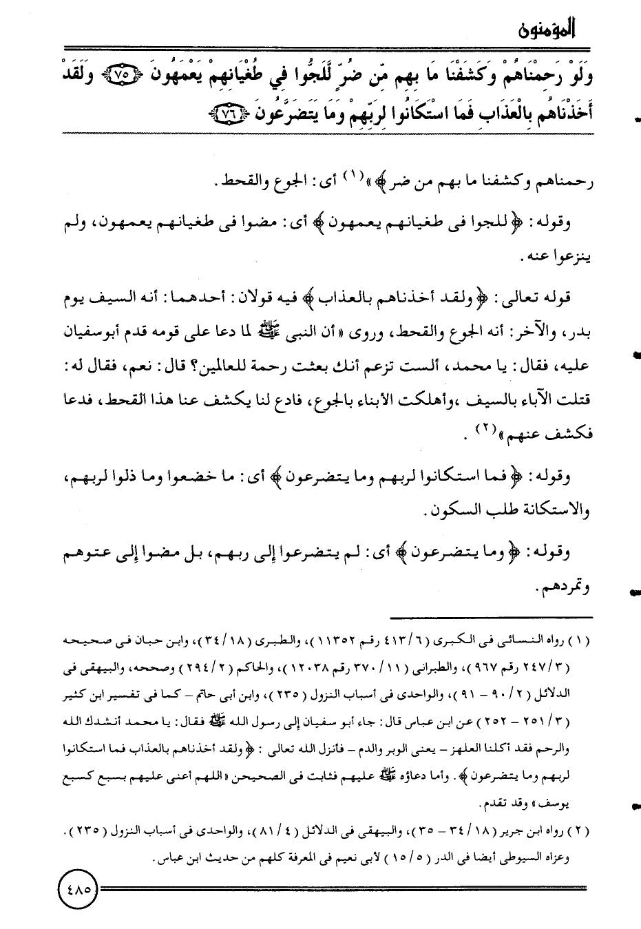 {وَلَو رحمناهم وكشفنا مَا بهم من ضرّ للجوا فِي طغيانهم يعمهون (75) وَلَقَد أَخَذْنَاهُم بِالْعَذَابِ فَمَا اسْتَكَانُوا لرَبهم وَمَا يَتَضَرَّعُونَ (76) } رحمناهم وكشفنا مَا بهم من ضرّ) " أَي: الْجُوع والقحط.