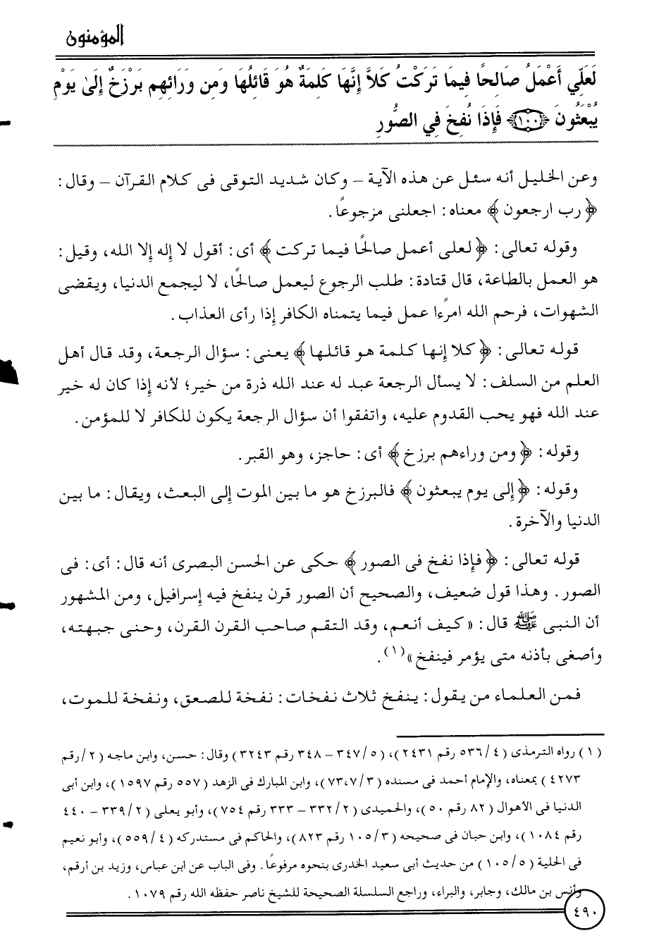 {لعَلي أعمل صَالحا فِيمَا تركت كلا إِنَّهَا كلمة هُوَ قَائِلهَا وَمن ورائهم برزخ إِلَى يَوْم يبعثون (100) فَإِذا نفخ فِي الصُّور} وَعَن الْخَلِيل أَنه سُئِلَ عَن هَذِه الْآيَة - وَكَانَ شَدِيد التوقي فِي كَلَام الْقُرْآن - وَقَالَ: {رب ارْجِعُونِ} مَعْنَاهُ: اجْعَلنِي مرجوعا.