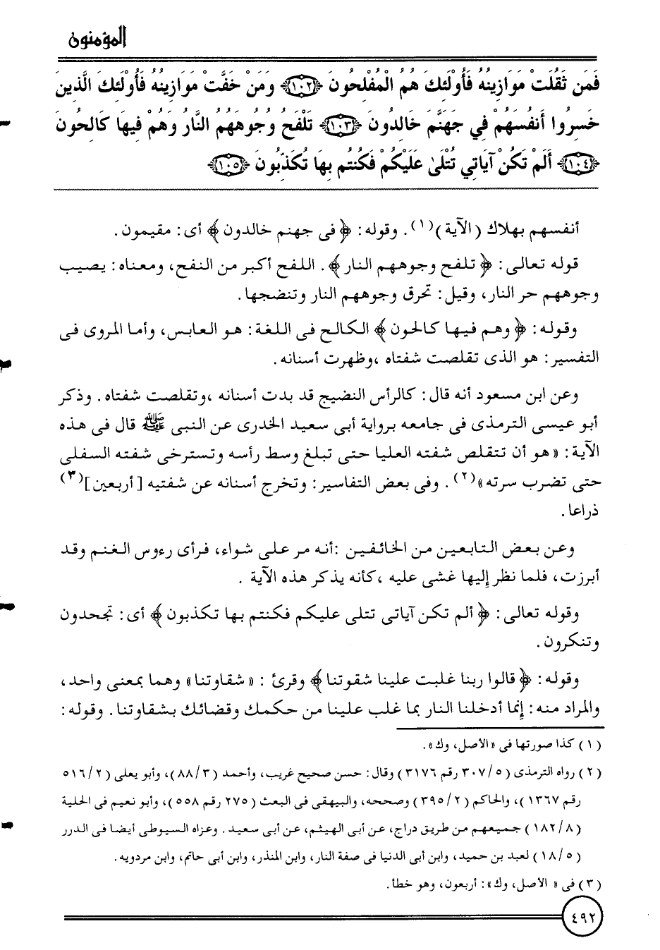 {فَمن ثقلت مَوَازِينه فَأُولَئِك هم المفلحون (102) وَمن خفت مَوَازِينه فَأُولَئِك الَّذين خسروا أنفسهم فِي جَهَنَّم خَالدُونَ (103) تلفح وُجُوههم النَّار وهم فِيهَا كَالِحُونَ (104) ألم تكن آياتي تتلى عَلَيْكُم فكنتم بهَا تكذبون (105) } أنفسهم بِهَلَاك (الْآيَة) . وَقَوله: {فِي جَهَنَّم خَالدُونَ} أَي: مقيمون.